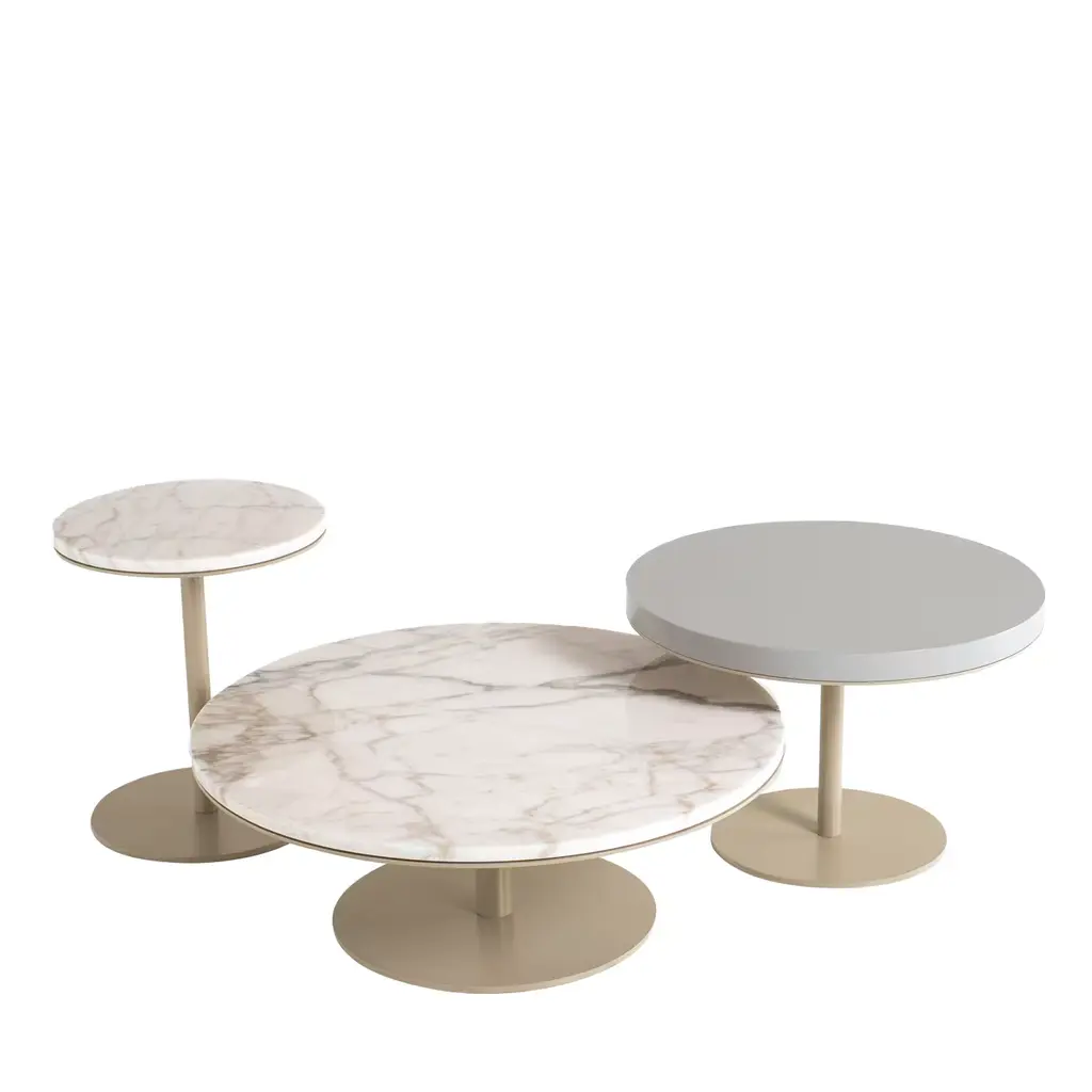 Mesmerizing shades of utmost refinement characterize the lavish aesthetic of this coffee table, a timeless accent to an elegant contemporary interior. Composed of two pieces, it rests on a sleek metal base made of champagne finished metal, and features two round tops in gold Calacatta and dark Emperador marble. Please consult the Concierge for further information.