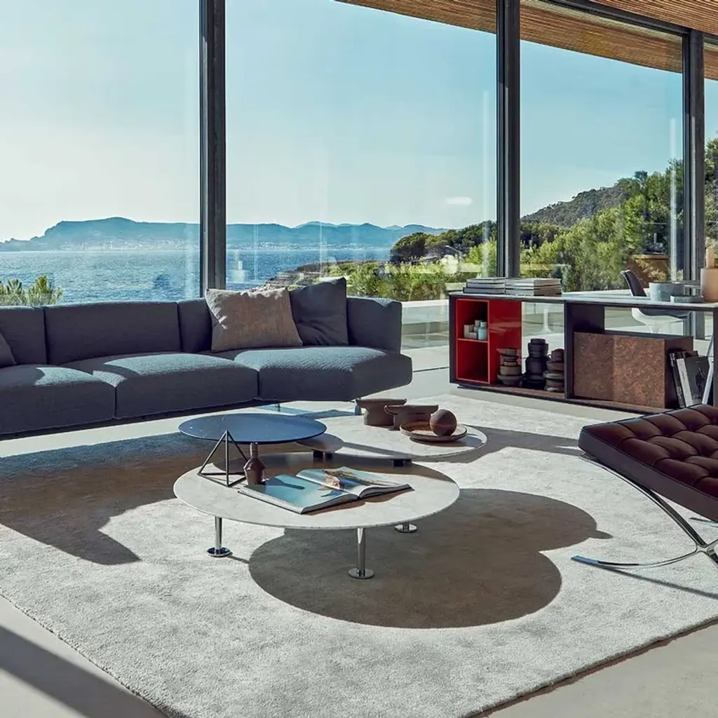Knoll presents Grasshopper, a collection of tables designed by Piero Lissoni, a perfect combination of pure geometry and synthesis of design. The modern table is where key decisions are taken, accommodating a range of functions from family reunions to business meetings.FEATURESGrasshopper also includes a family of low tables conceived as a minimal planetary system. Suspended at different heights, they turn as if floating in thin air, supporting the hypothesis that a gentle spirit is an ethereal gift. The low tables use the same materials and combine with the main round tabletop to produce secondary, differently sized tables that can be moved along the perimeter, tracing out circular orbits. The versatility of these tables derives not only from their clear, geometric aesthetic and their different sizes and heights, but also from the variety of finishes available for the top. Easily adaptable, they add an equally refined touch to the private living room or the public lounge area.CONSTRUCTIONTop: Bevel-edge satin smooth laminate, marble or chestnut veneer. Rounded edge back silk-screen painted frosted tempered extra clear glassBase: polished chrome, burnished or painted metal.Note: the tables are fixed when they are in a set of two. The table of dia 70 can be moved 90° if it is part of a set of three.FINISHESTables are available in laminate, glass, wood and coated marble in a wide range of colours and in the veneer.