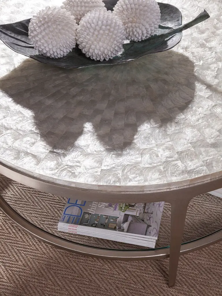 Lend subtle seaside charm to any space with this stunning coffee table, hand-forged of iron with a clear glass shelf and shimmering capiz shell surface. Because this piece is made using natural materials, variations in color and tone are to be expected.