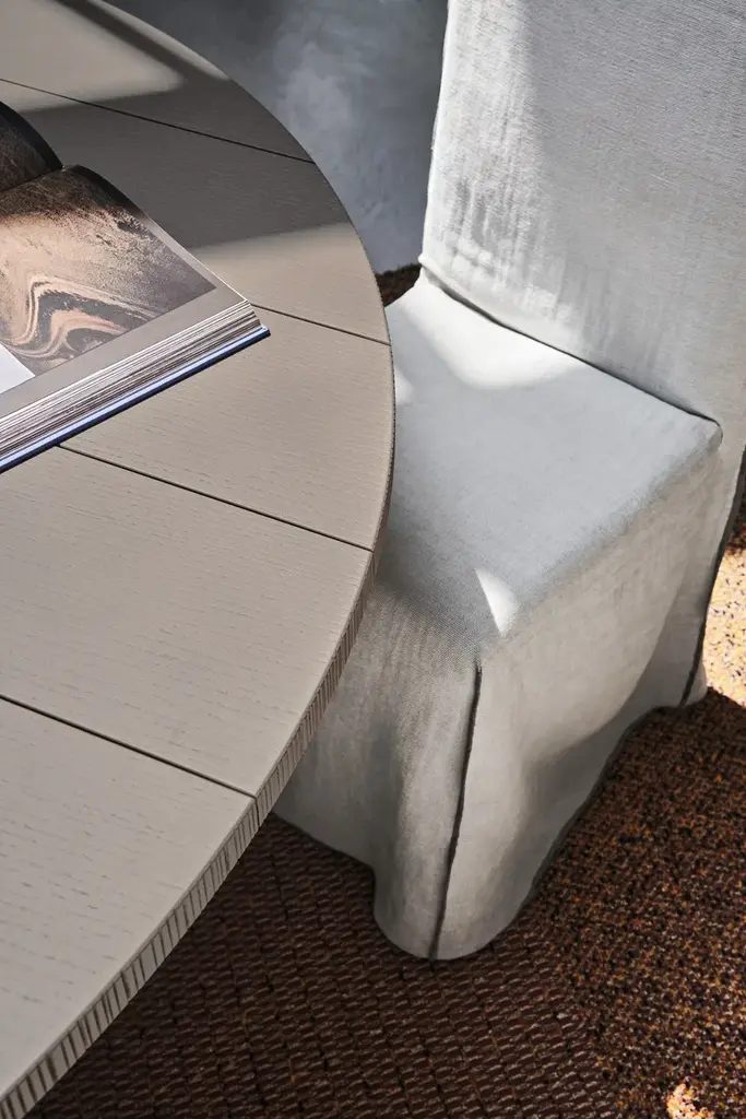 The Gray 38 table perfectly balances different materials for a versatile solution. The sculptural, elegantly curved white stoneware central leg can be combined with a slatted walnut or oak top available in the colours of the collection or in white Carrara marble.Vintage soul and contemporary design characterise the Gray 32/33/34/35 family of tables. Available in different sizes with a square or rectangular top, they feature different materials that combine to create multiple possibilities. The top with slats veneered in walnut or oak, white Carrara marble or waxed iron sheet, is joined by four legs in walnut or oak, in white porcelain, white Carrara marble or in cast polished aluminium, with elegant triple turning. Available wood finishes: natural painted Canaletto walnut, bleached oak or white, grey, black, ocean or dove-grey lacquered oak, Blueberry, Date, Ginger.Vintage soul and contemporary design characterise Gray, an articulated collection of chairs, armchairs, sofas, tables and coffee tables that mixes the austere elegance of classic furnishings with the simplicity of Nordic forms. A collection in solid walnut or oak embellished with workmanship, shapes and unusual materials, such as stone, porcelain, aluminium and marble.