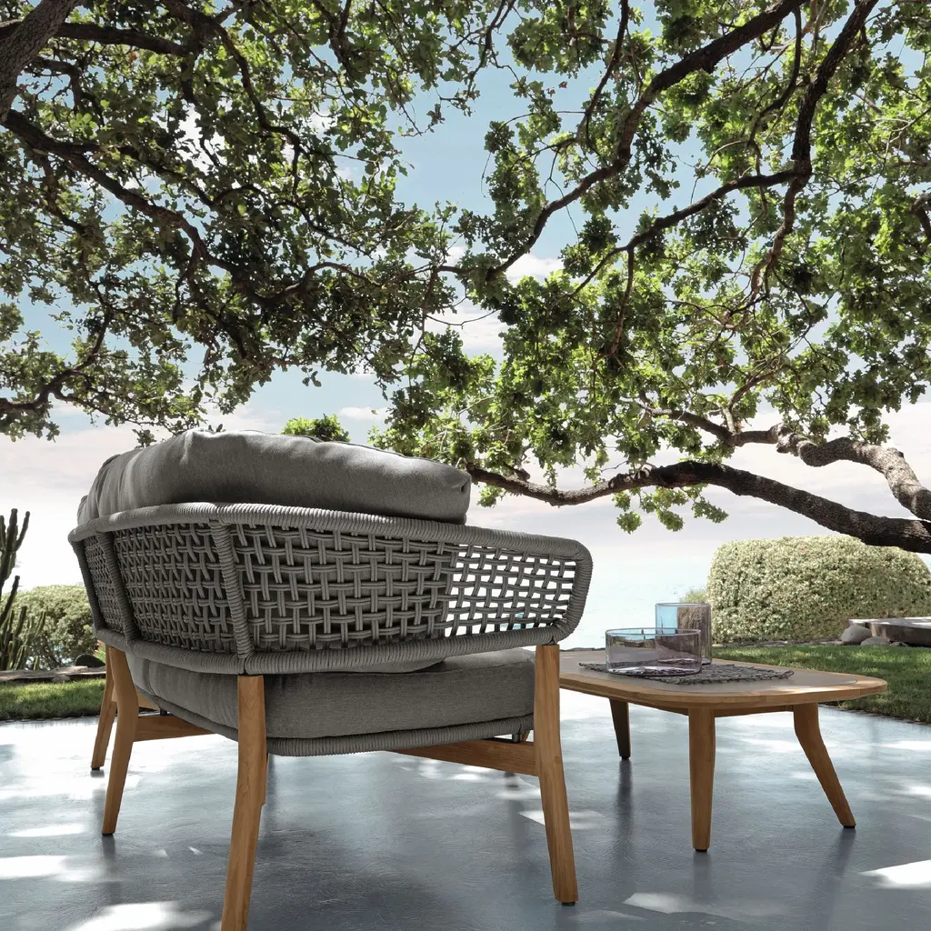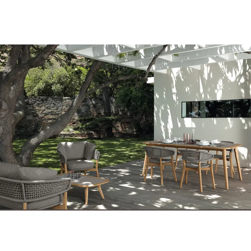 The coffee table of the Moon outdoor collection has a rectangular shape with rounded corners that give it an elegant softness. The structure and the perimeter border are in natural teak and it has grey hpl top.