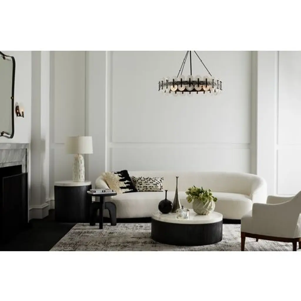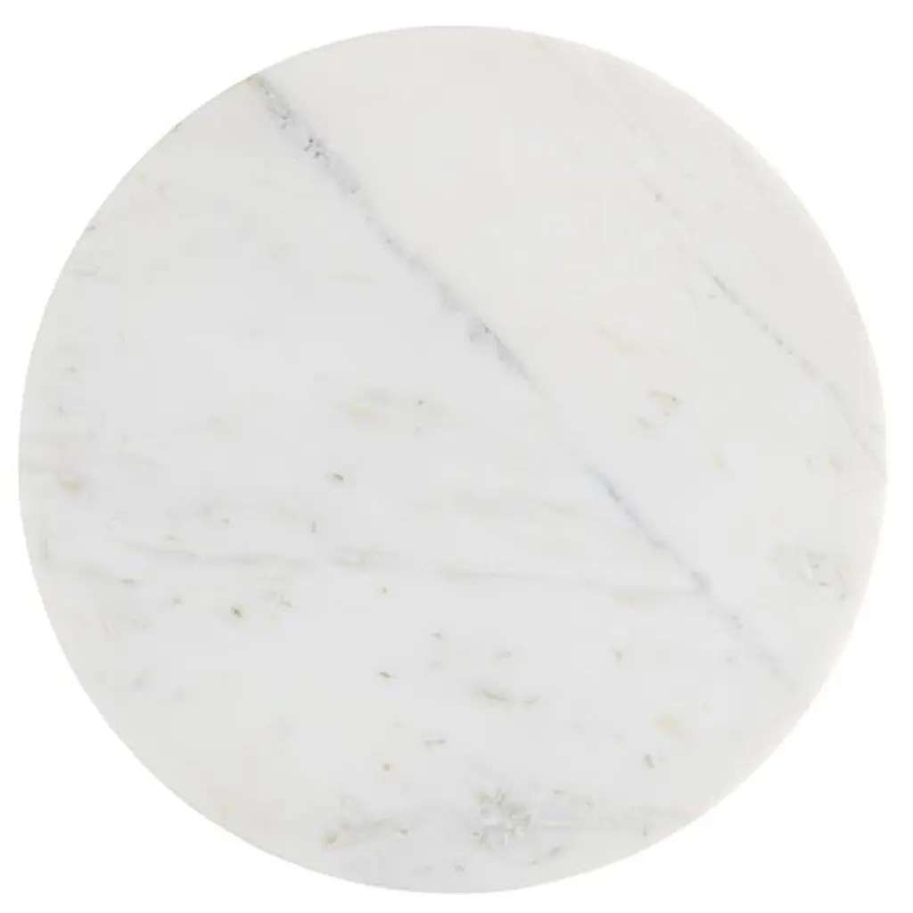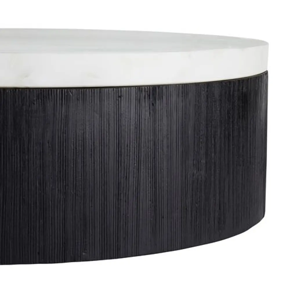 A round slab of white marble rests atop a wood base given a black finish. The result is simple yet sophisticated—organic elegance at its finest.