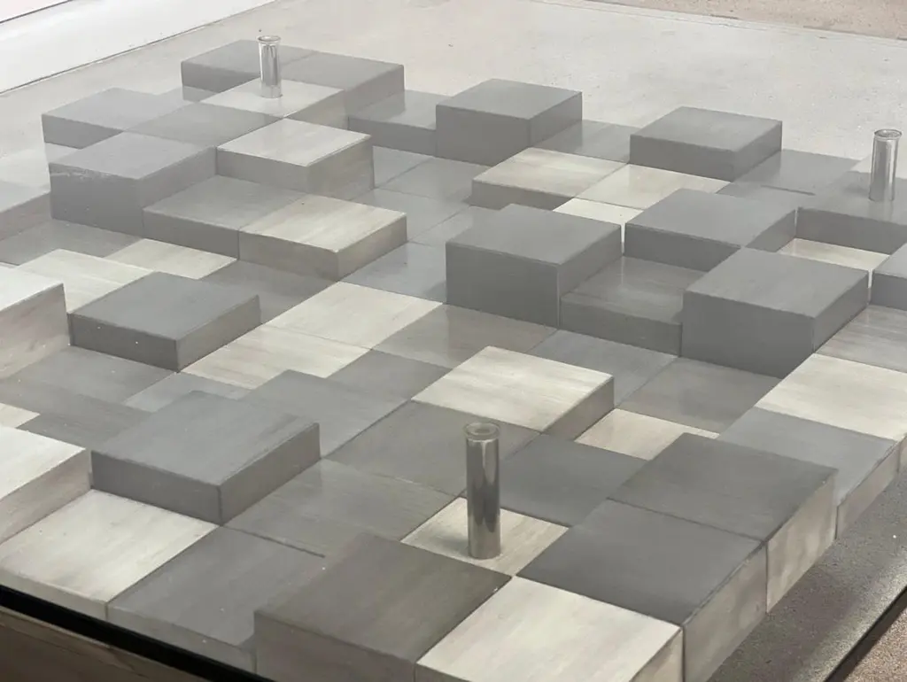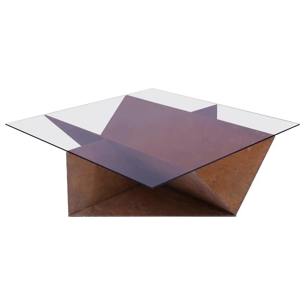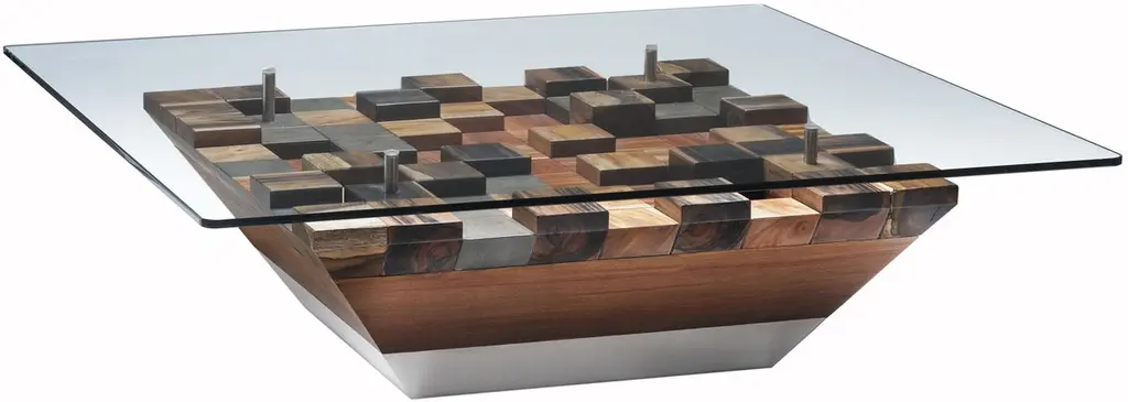 The base of this glass-top table is crafted from an intriguing combination of woods and stainless steel, forming captivating geometric shapes. This unconventional design adds a distinctiveness to the piece, making it truly remarkable. The use of different wood types and stainless steel creates a visually striking foundation that beautifully complements the glass tabletop. It's a unique and eye-catching choice for those seeking a distinctive and modern aesthetic.