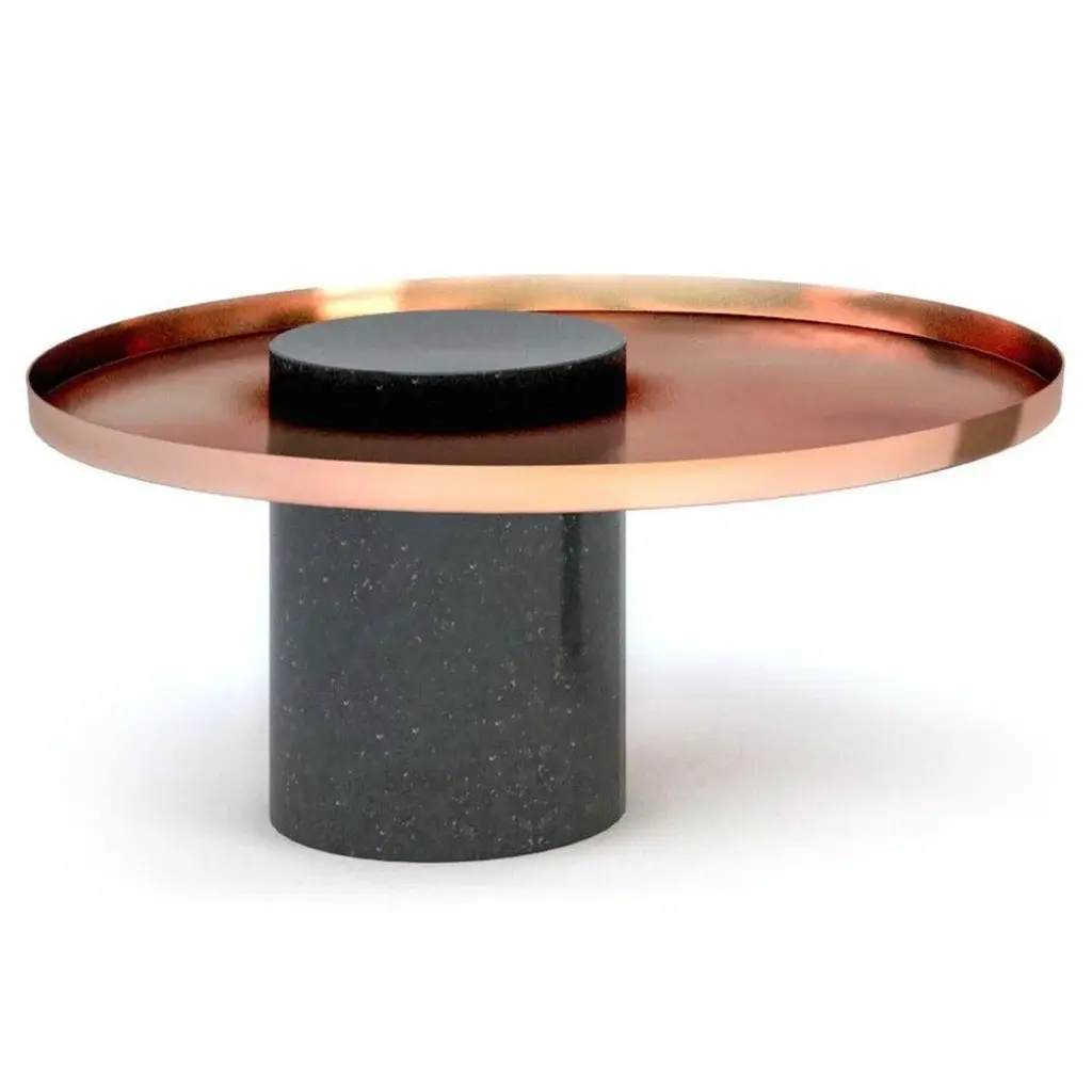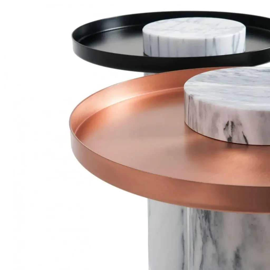 Contemporary Gueridon - Sebastian Herkner The Salute table exists in 3 sizes, 3 different marbles for the column and 4 different finishes for the tray for a virtually endless number of configurations. In addition, Salute can be made bespoke with special colors materials and stones. High salute: Height 22.4 inches Diameter 16.1 inches Weight: 95 lbs Medium salute Height 16.53 inches Diameter 7.1 inches Total diameter 15.75 inches Weight: 75 lbs Low salute Height 13 inches Diameter 27.5 inches Weight: 106 lbs. Salute is a family of tables mixing marble and metal for a high visual impact. As an occasional table, Salute is the perfect companion to your iconic armchair or next to a comfy sofa, with its clean lines and yet strong personality and impact. As a combination of tables, it is a sculptural coffee table that you can customize and adapt both in dimensions and colors. Salute is a family of Gueridon tables. Each element can be used alone or combined together to play with diferent heights and formats as well as combinations of materials. The strong presence of the marble column is lightened by the suspended shape of the metal tray. This piece is attributed to the mentioned designer/maker. It has no attribution mark and no official proof of authenticity, however it is well documented in design history. I take full responsibility for any authenticity issues arising from misattribution