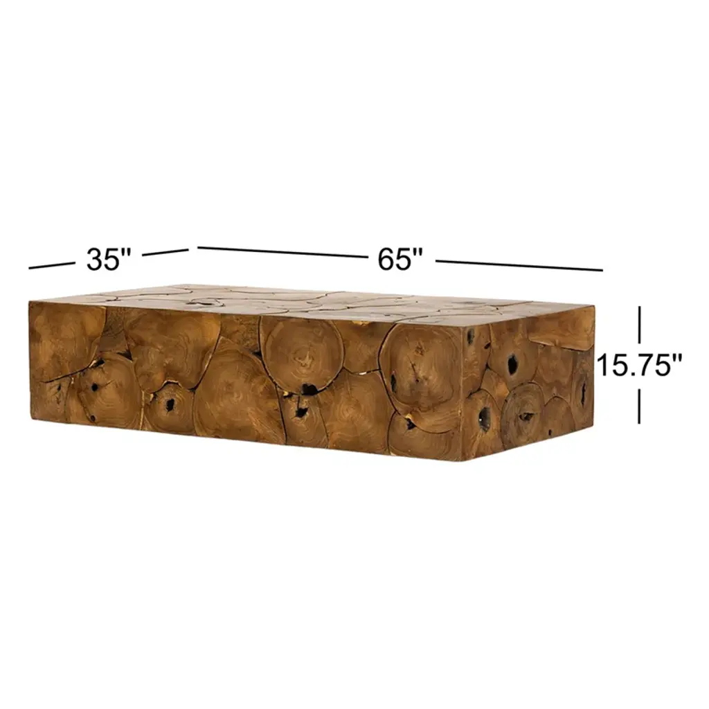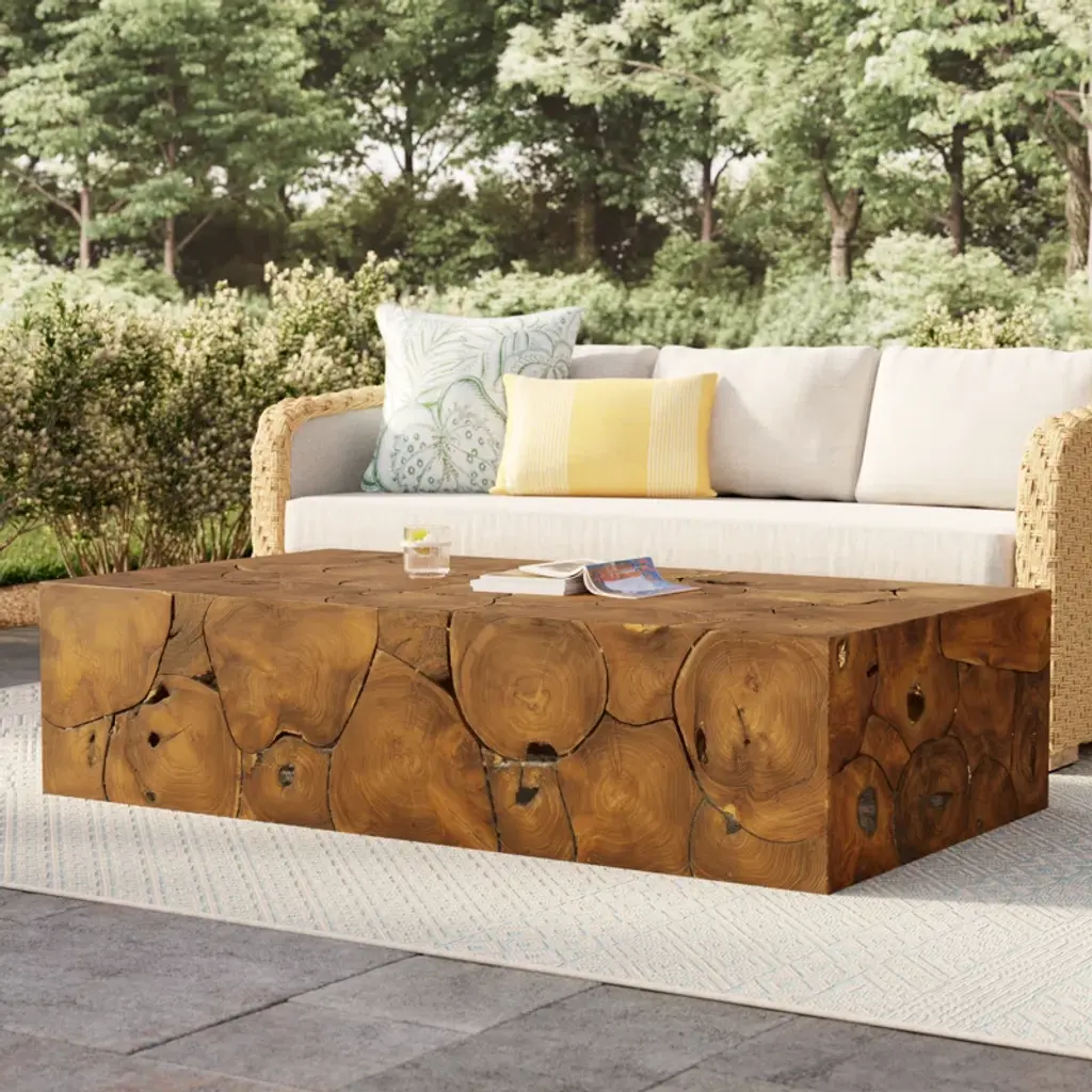 A unique layering piece indoors or out. Made from laminated teak root with miter joinery, a simply shaped coffee table offers organic vibes and plenty of natural movement. Tables will vary from piece to piece, reflective of natural materials. Joint expansion may grow visible over time. Cover or store indoors during inclement weather and when not in use.