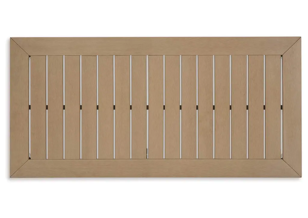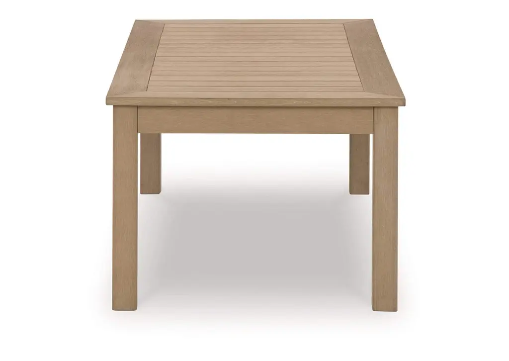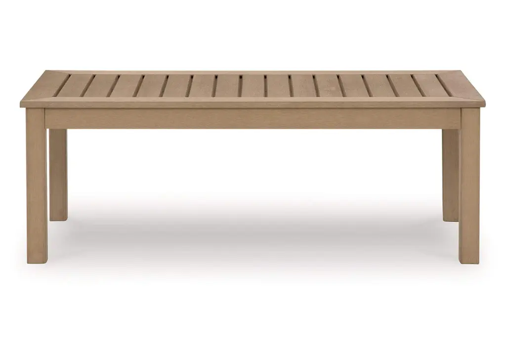 The Hallow Creek coffee table is a beautiful addition to any outdoor living space. Effortless in its simplicity, this piece echoes your easygoing sensibilities. Combining durable, cutting-edge engineered materials, its Weatherwood construction in a blond wood color enhances the contemporary design. Pair this table with the matching sofa and chairs for a spectacular backyard or patio seating arrangement. Weight 65.000 lbs. (29.25kgs.)