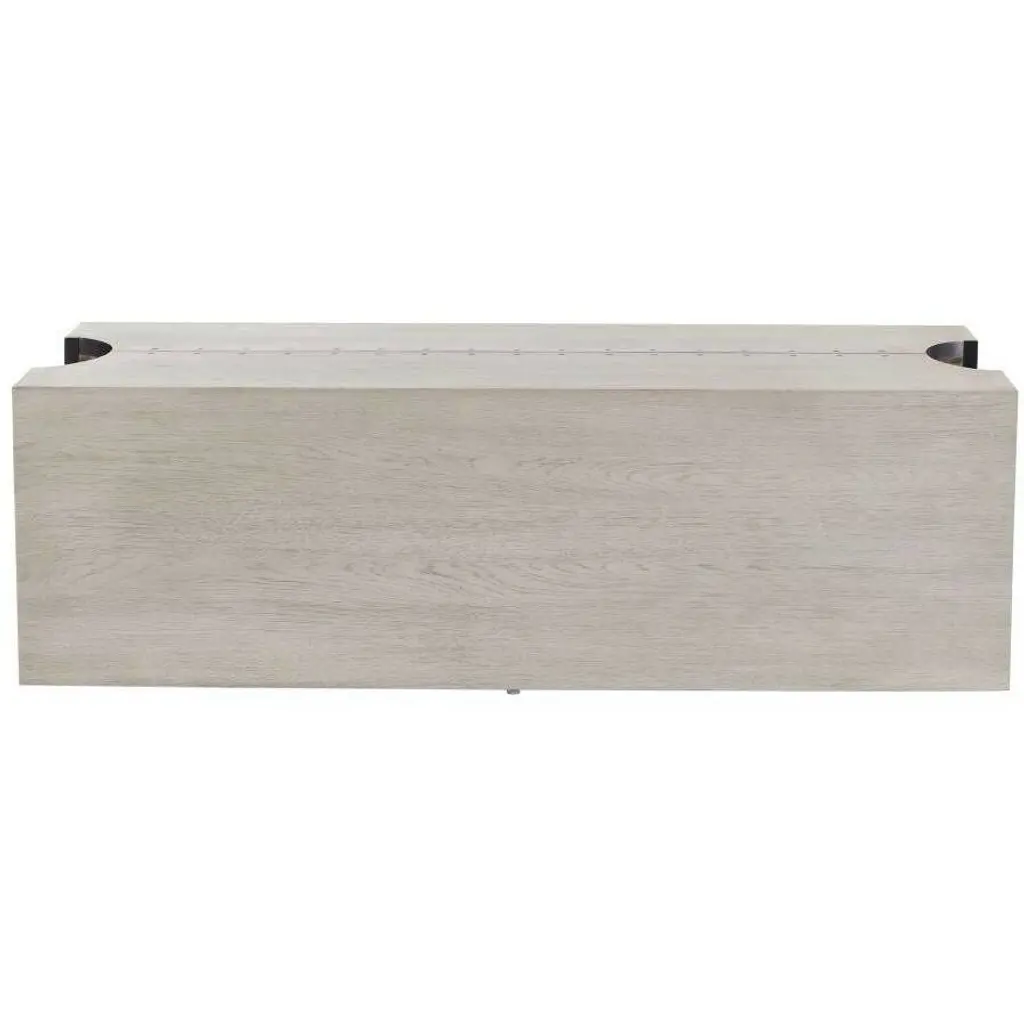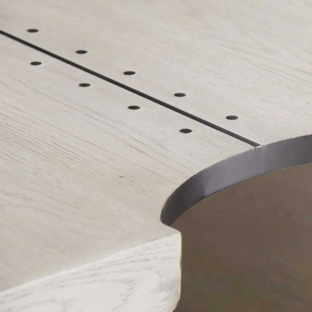 A playful style of smoke oak veneer, blackened iron in button accents and cutout details borrowed from tailoring, dress up the distilled and minimal form with an element of surprise. Wood will vary.