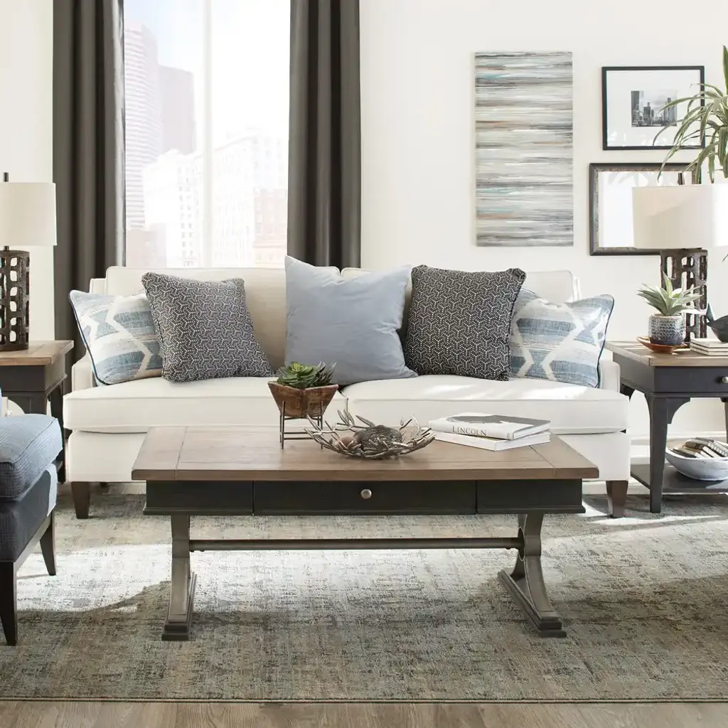 The Hancock Coffee Table combines rustic charm with refined craftsmanship, featuring cathedral grain white oak in a casual two-tone finish that enhances its natural beauty. The rich wood tones seamlessly blend with metal accents, creating a balanced, textured aesthetic. A convenient drawer provides discreet storage, while a sturdy metal stretcher adds both style and stability. Designed for versatility, this table brings warmth and character to any space, offering a perfect mix of functionality and timeless appeal.