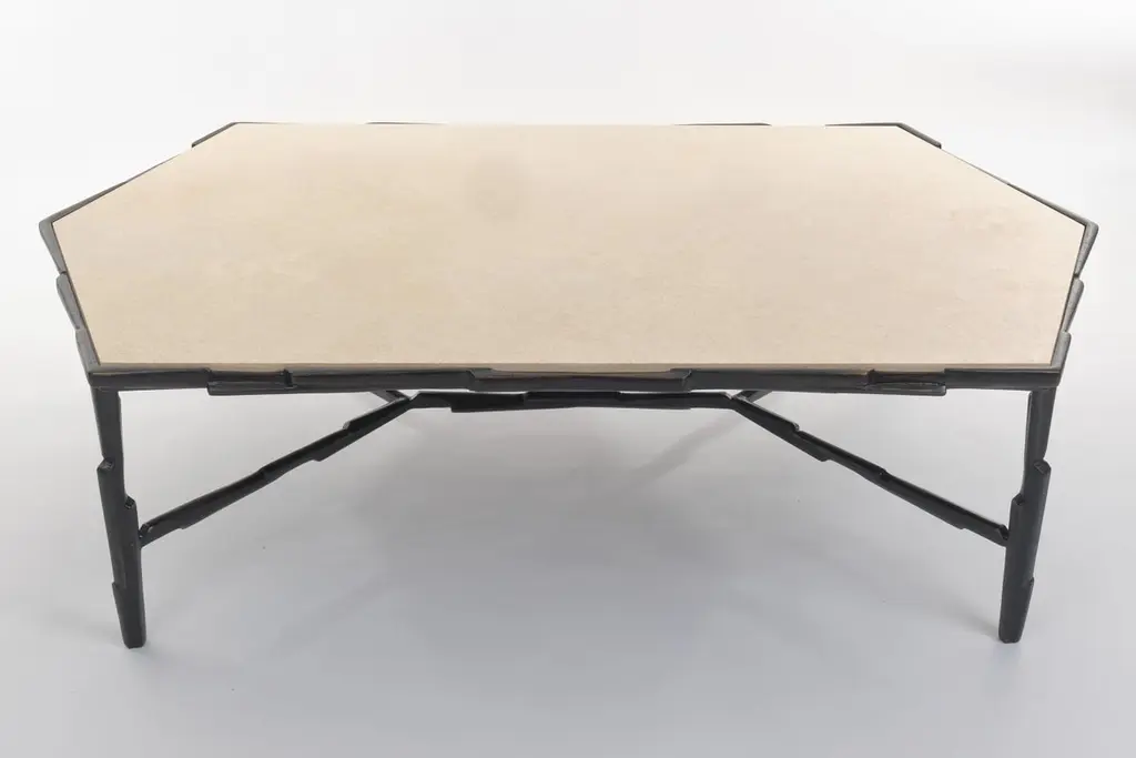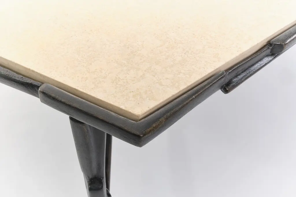 The LINEA coffee table has a strong and dynamic silhouette based on the figure of the triangle. Fragments of metal, shaped and assembled in line with a secret sense of order. The metal armature is reinforced with plaster bandages for durability before being sculpted by hand, achieving a brushed finished.. The piece of furniture is crowned by a travertine top. The stone is set in a hand sculpted frame. The unique texture, both raw and refined, catches the light and contrasts ideally with the silky appearance of the travertine top. Edition size-20. NET WEIGHT approx 72kg SHIPPING Please ask us for a quotation. We are able to offer very competitive shipping prices, including insurance of the goods.Handmade in Germany
