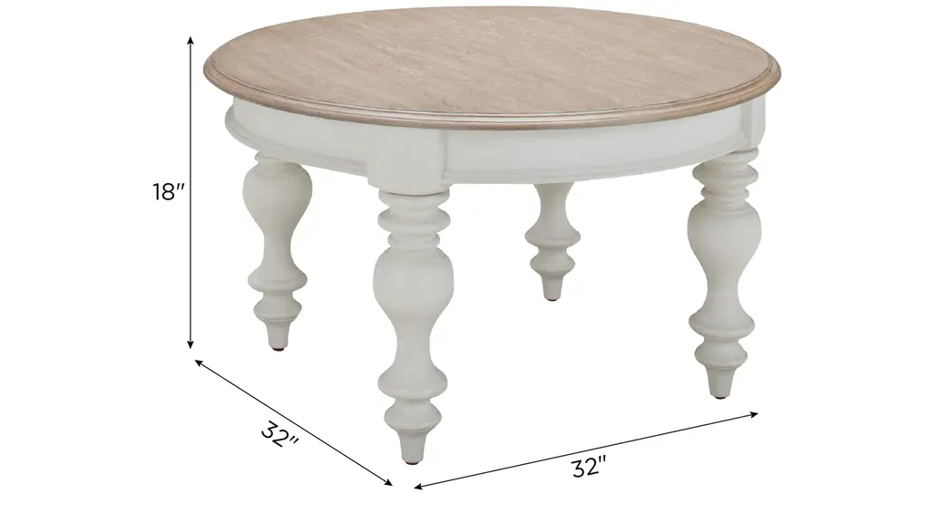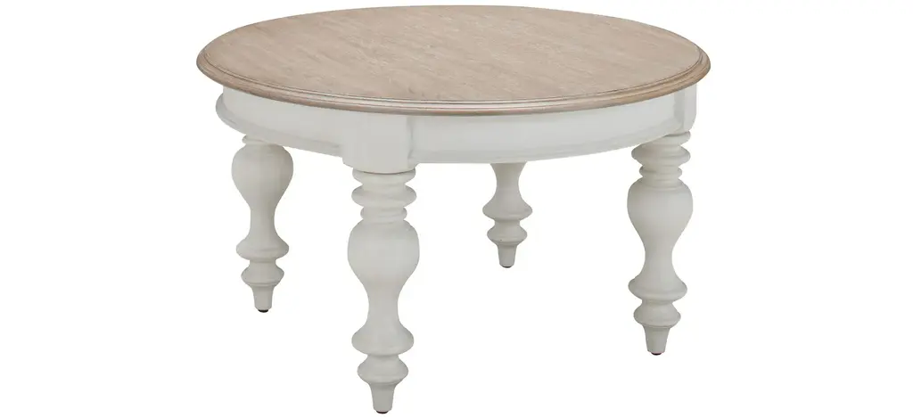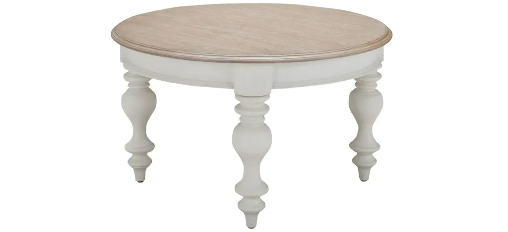 Bring fresh energy to a traditional living space with a coastal or cottage style that's both charming and functional. The Harcourt round cocktail table has pleasingly chunky silhouette that's perfectly complemented by its clean white frame and distressed oak top finish.