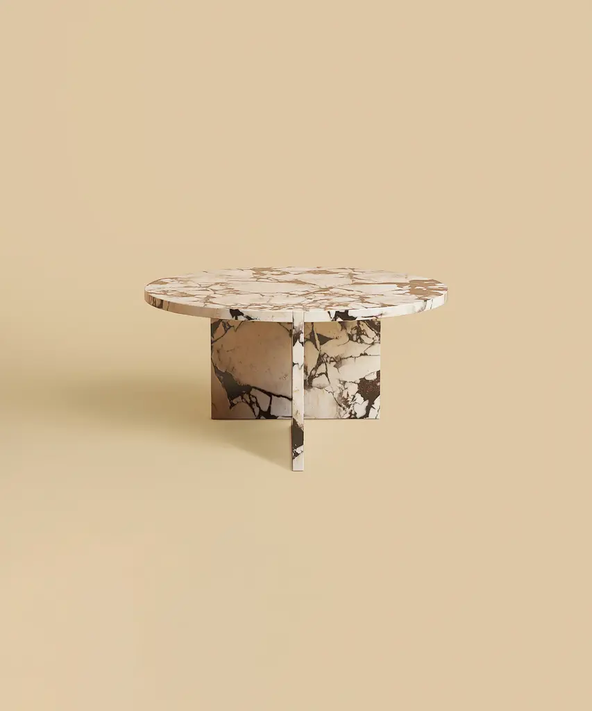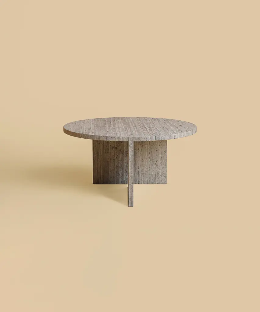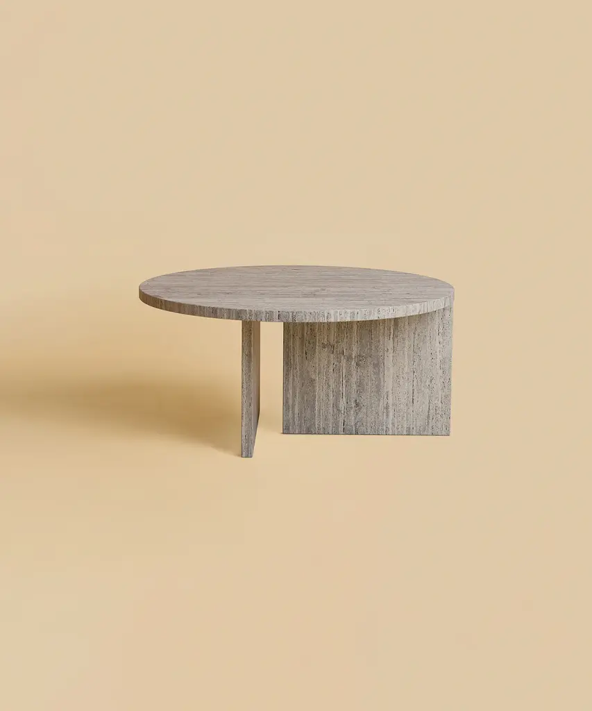 The Hashi coffee table is made entirely of Travertine or marble. The top is circular and has a diameter of 23.6 inches, and the legs are made from two slabs in which one part is interlocked on the top. Founded by Emanuela Terraneo and Alessandro Pozzi, Lebanto designs and produces modern and refined furniture in Cantù, Italy.