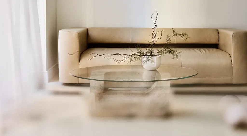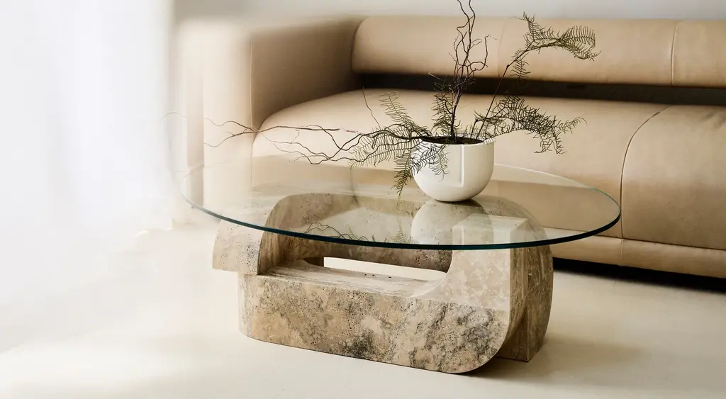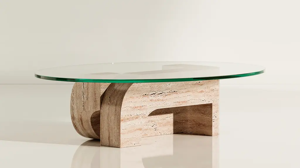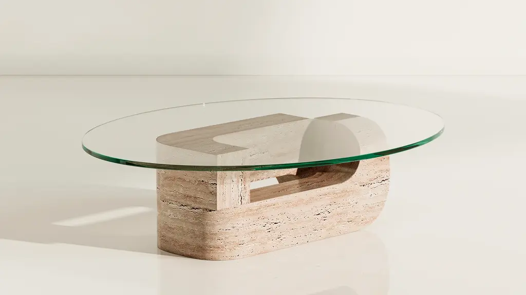 Hathor is the first collaboration between Farrah Sit and TRNK Collection. The collection is inspired by Farrah’s pilgrimages to ancient monolithic structures and her reactions to their divinity and timelessness. In deference to the gentleness of raw materials, each design balances levity and weight, negative and positive space. Hathor - with its generous curves and continuous forms - evokes the cyclical and infinite exchanges between past and present. Pictured in Grey Travertine Base and Clear Tempered Glass Top.
