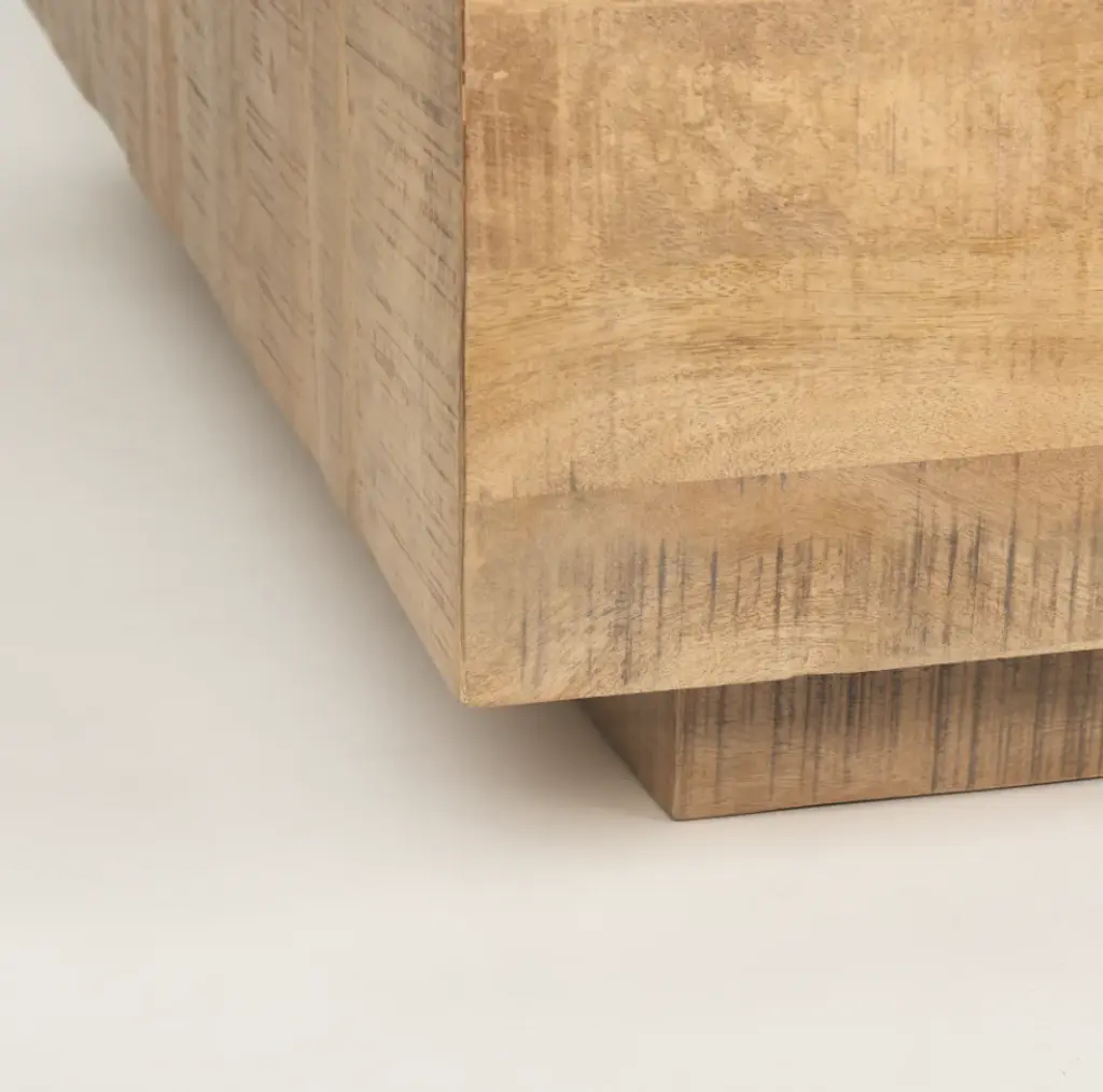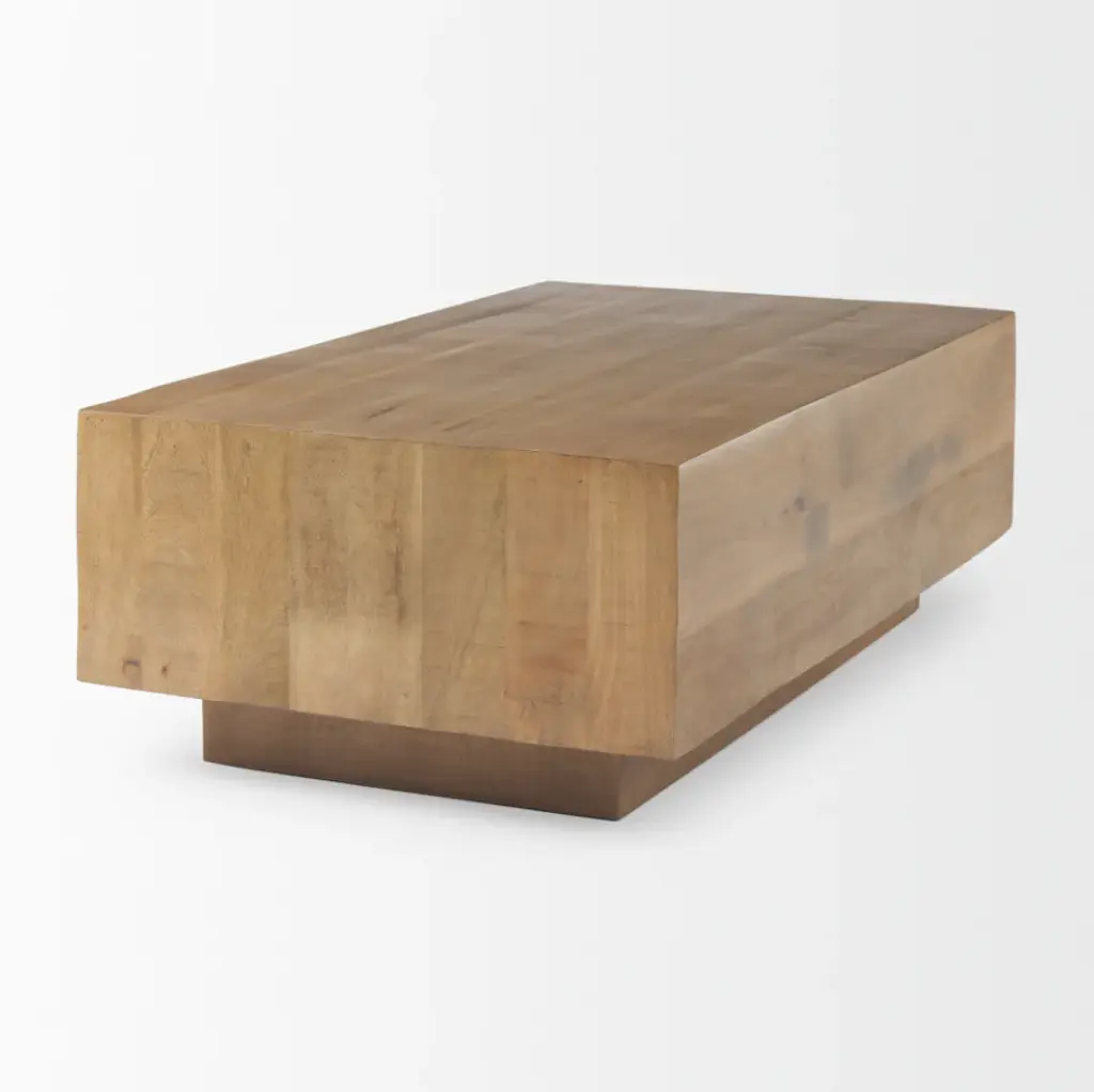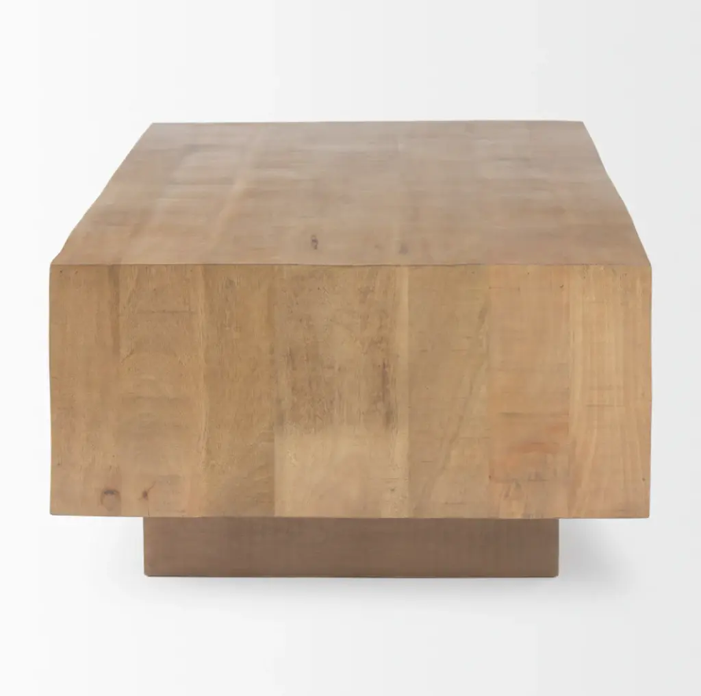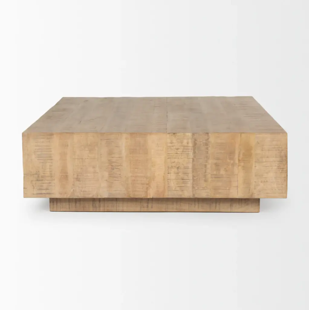 The Hayden coffee table adds an organic depth to a space with its natural, distressed texture and rustic, minimalist design with its box-like tabletop on a recessed base giving the illusion that it is "floating" in the room.
