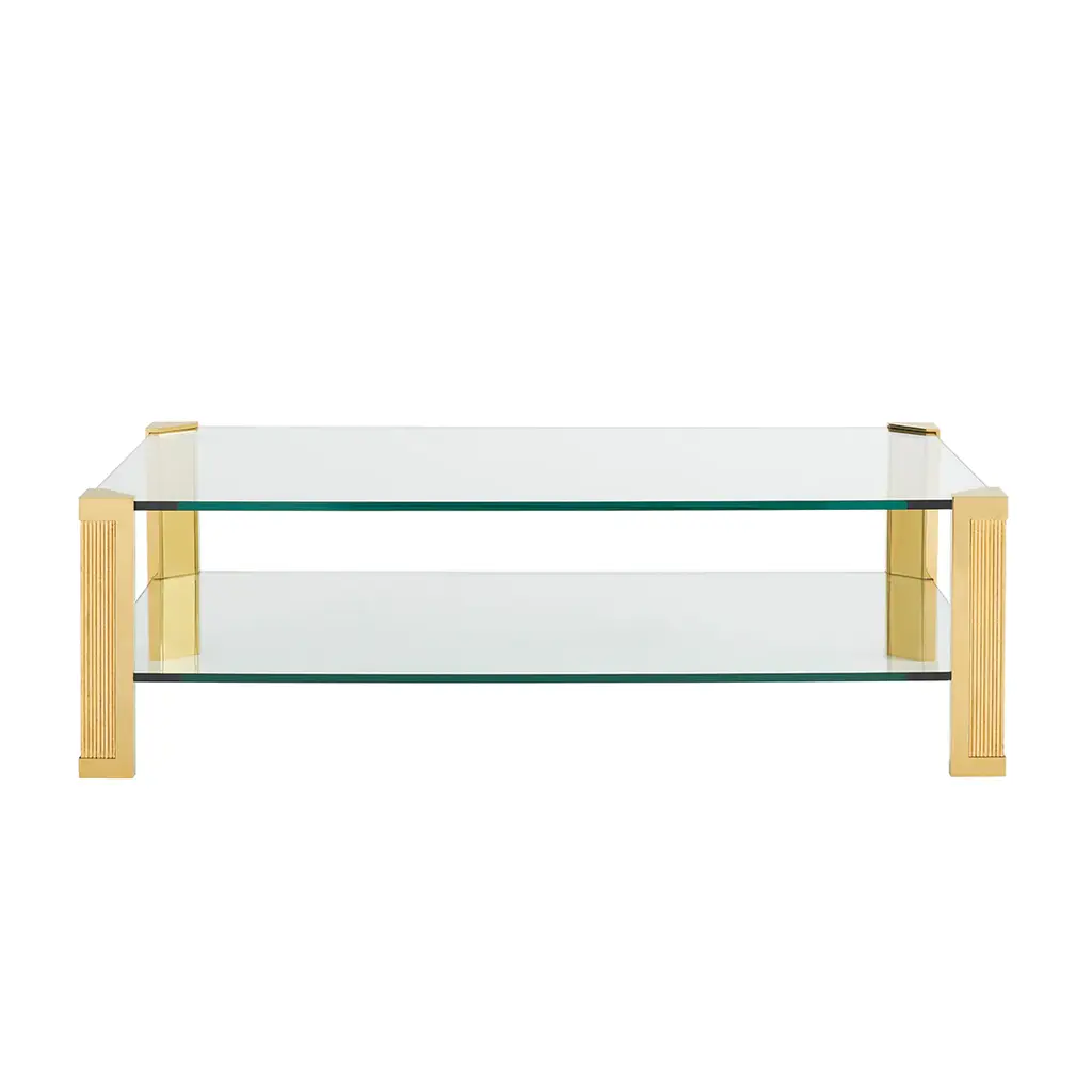 Our Heath coffee table brings 1980’s vintage glamour to any seating area. A clean Architectural form, the Heath is perfect for adding sophistication to any décor. Ships In 4-5 Weeks Tempered glass shelves Brass finish This image is for illustrative purposes only. The colors shown are accurate within the constraints of lighting, photography, and the color accuracy of your screen.