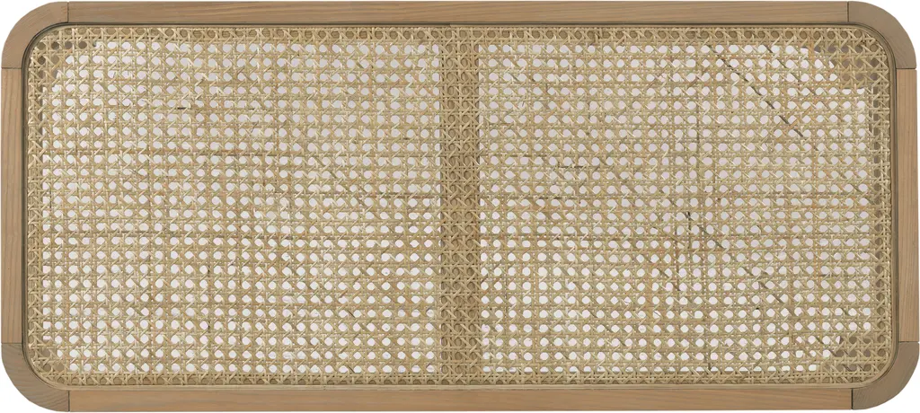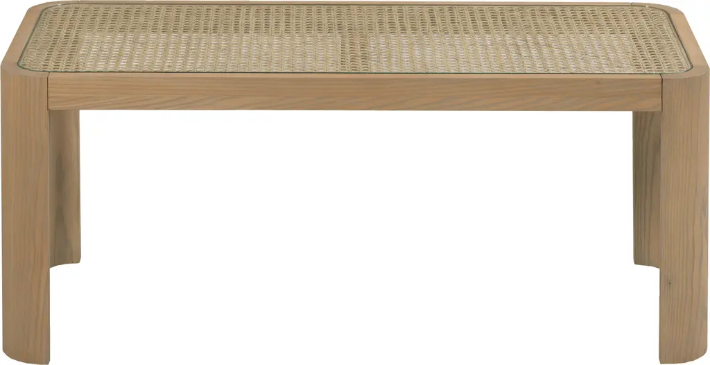 A top of open woven cane, protected by tempered glass, is set within this cocktail table's durable ash frame. Rounded corners and legs provide contemporary allure.