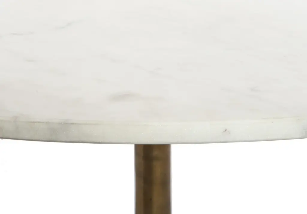 Sleek and minimal, the Helen is a tasteful addition with its slim, tripod base in raw brass. A wide, polished white marble top completes its look of simple sophistication, lending an organic touch. Style in a living room or office with a sofa or chairs.