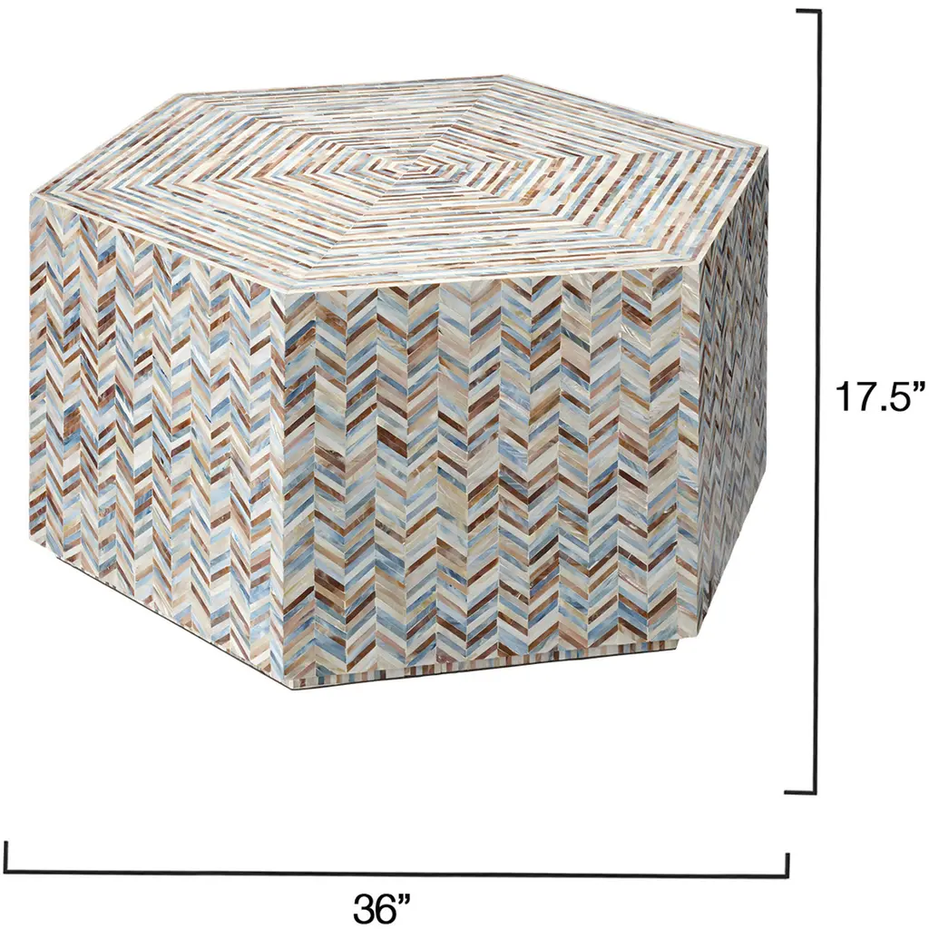 A jewel of the sea, Mother-of Pearl is a natural substance with rich luminescence, and each piece of it is unique. Small, multi-color strips of the iridescent material are carefully selected and expertly placed to create the intricate mosaics the cover every inch of these accent tables. Carefully contrasting their opulence with restraint, their geometrical shapes are kept deliberately simple. Place next to a neutral sofa or overstuffed chair to create a unique focal point to your room.