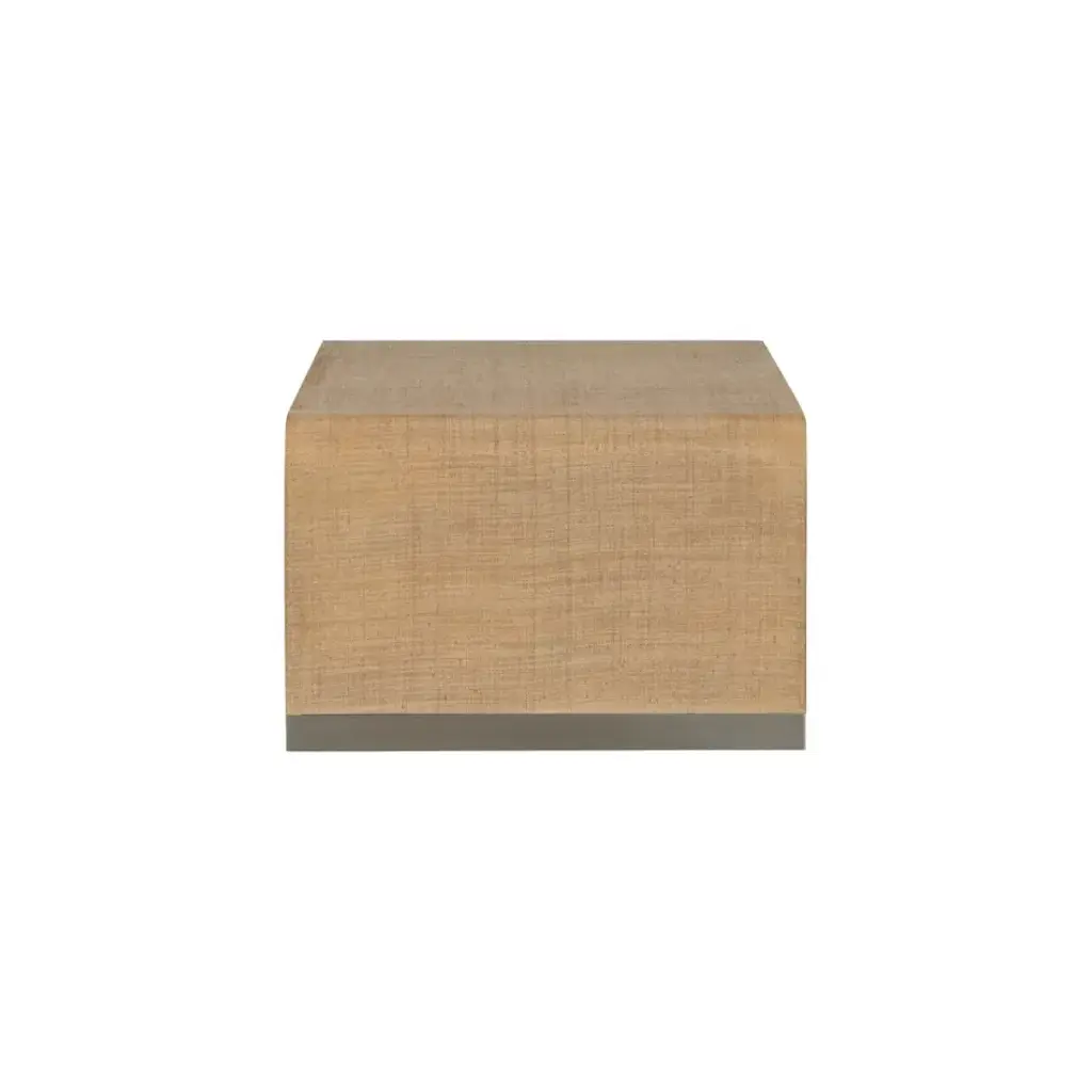 The open Greek key shape of the Hera coffee table is a versatile piece that can complement a variety of styles. This wooden table is wrapped in natural Saguran for a sophisticated yet durable finish. The brushed metal accents add further material interest and elegance.