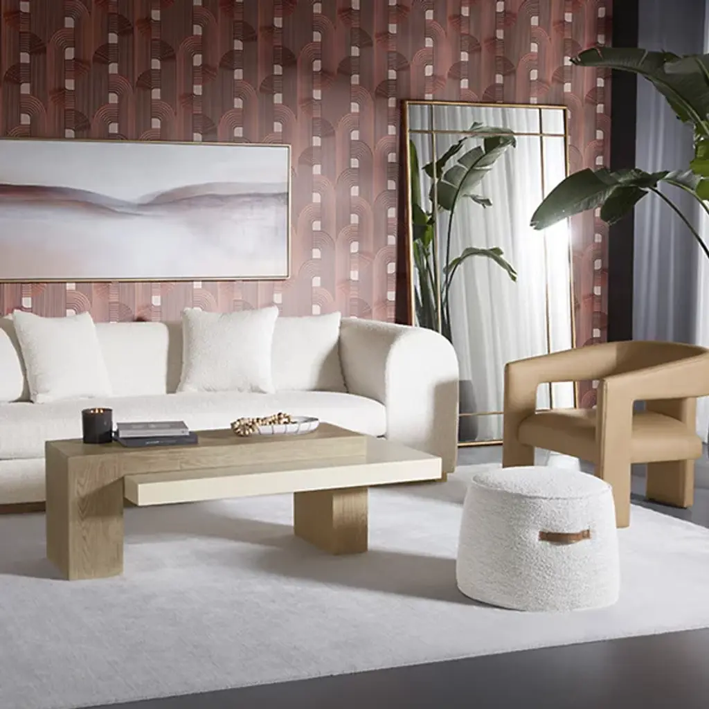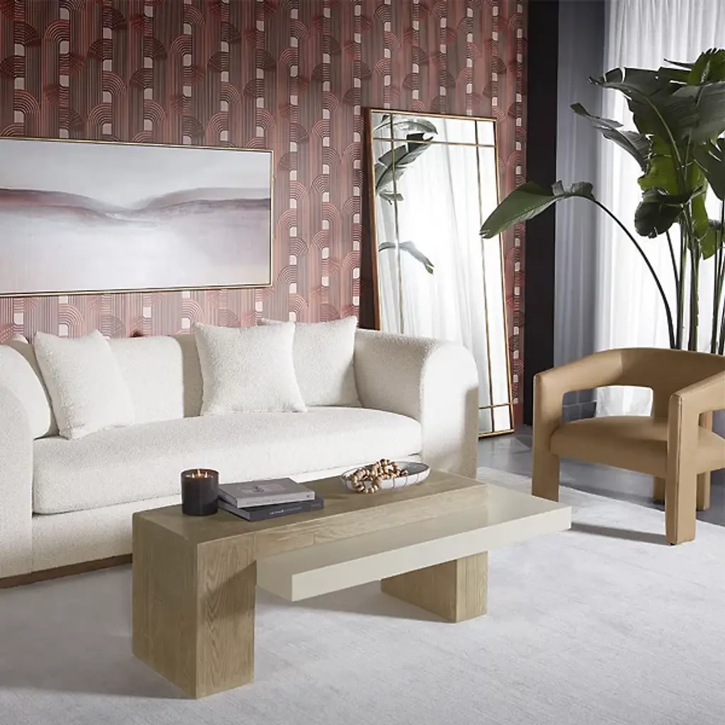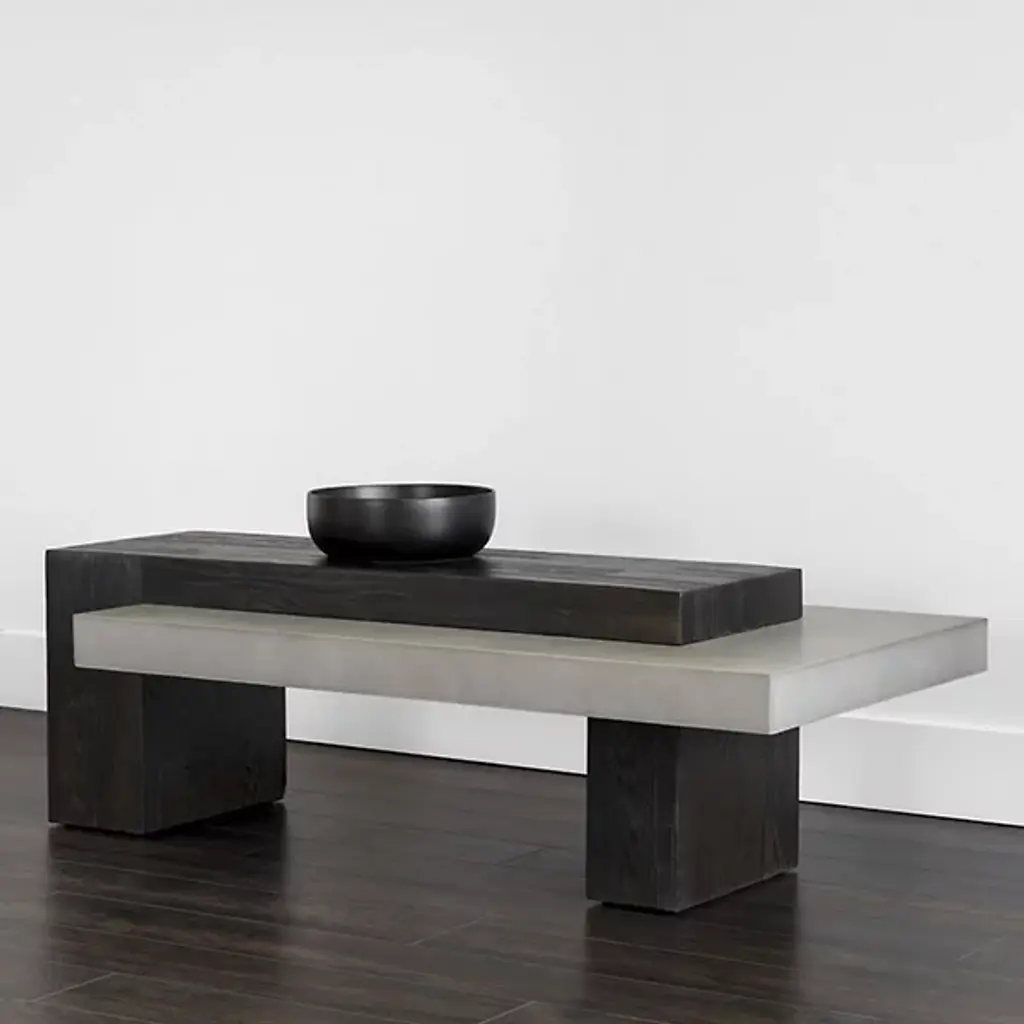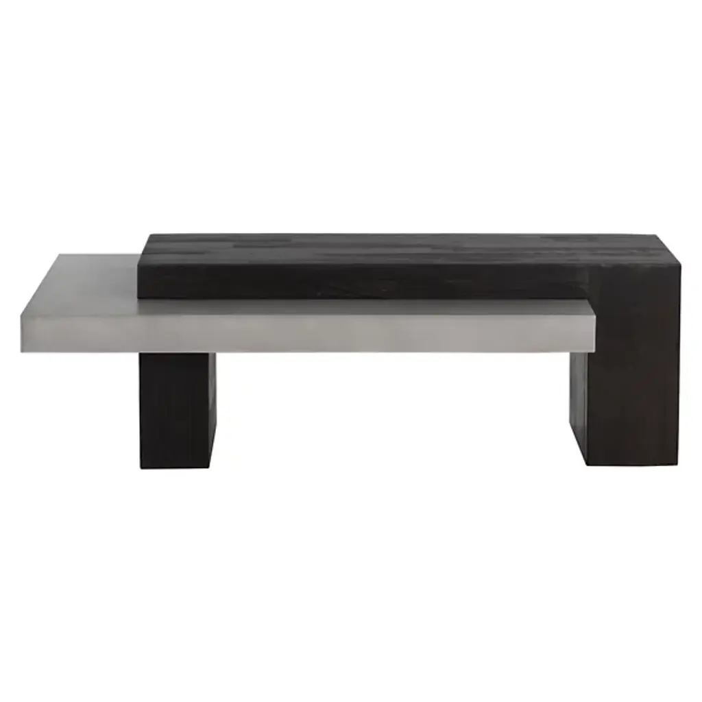 The Herriot Coffee Table from Sunpan is a centerpiece rich with bold contemporary flair. Its naturally-colored concrete base features a timber-inspired texture, paired with a grey concrete slab top for a striking contrast. Made from durable, glass fiber-reinforced concrete and sealed with a protective topcoat, the table resists moisture and stains indoors or out. Each table is uniquely formed from a concrete mix, presenting individual variations in texture, color, and subtle imperfections that enhance its character, blending artistry and functionality.