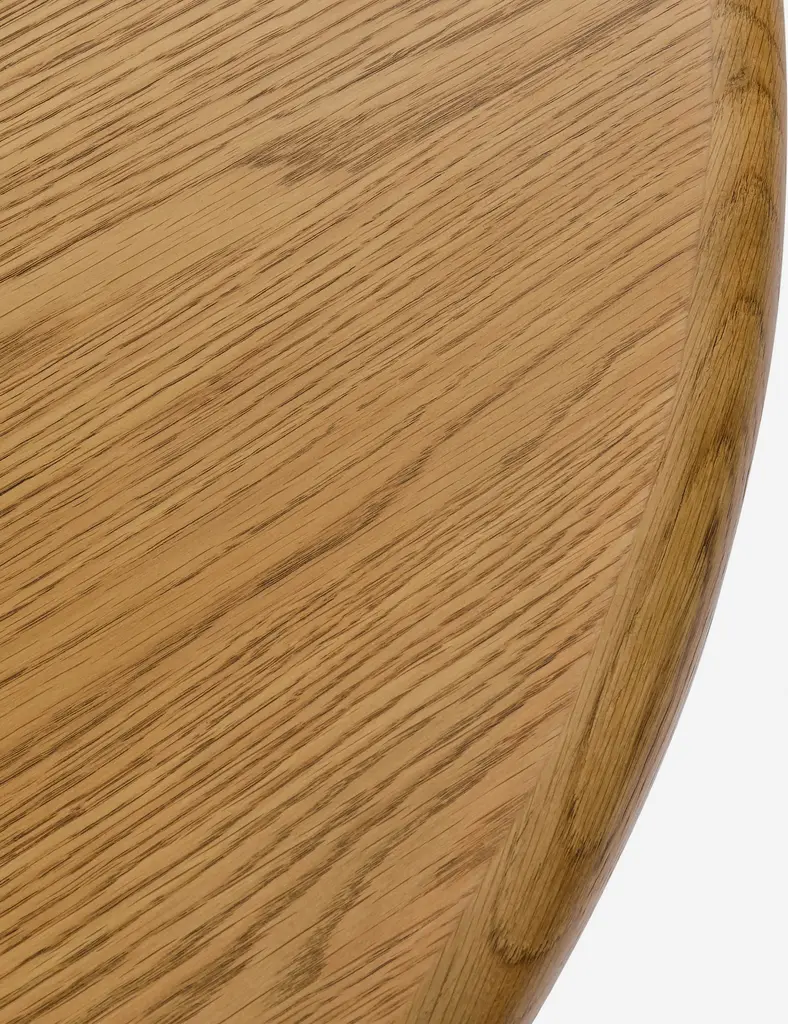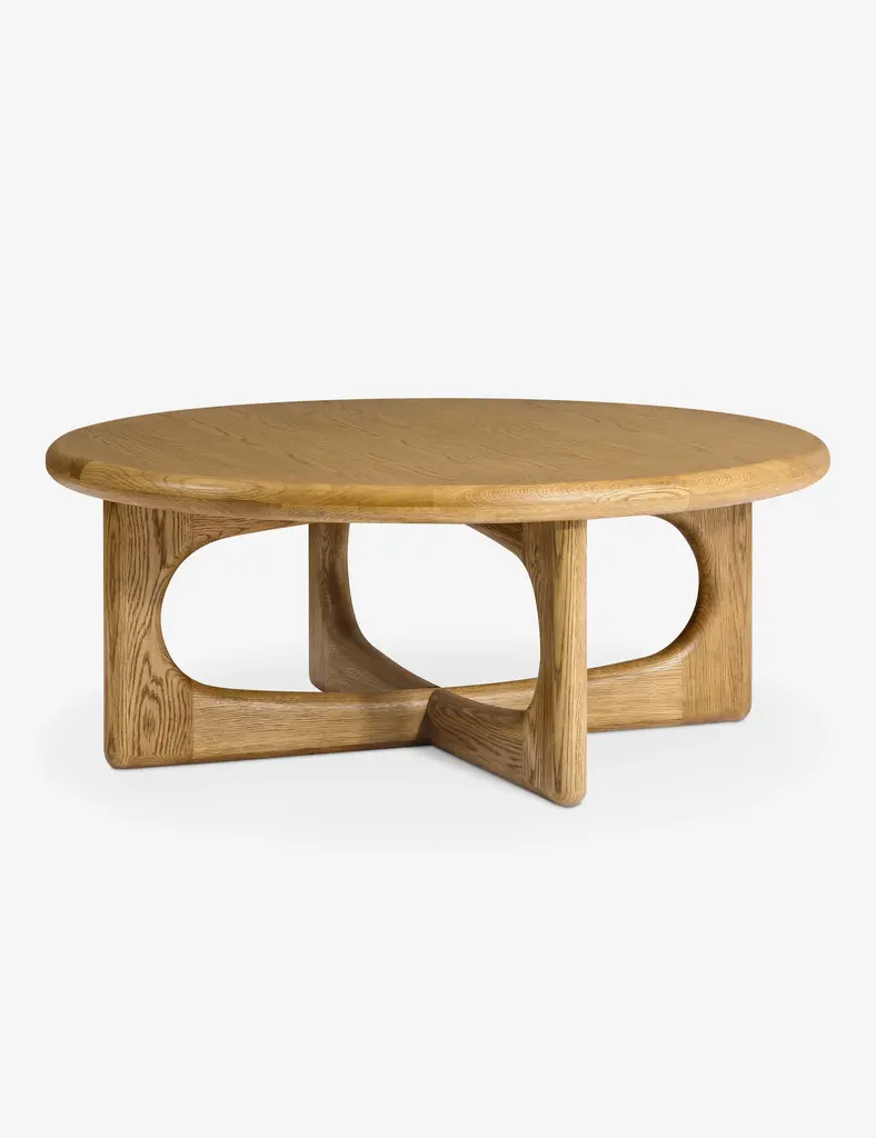 The Hesh coffee table pairs soft lines with the natural grain beauty of oak. Carved cutouts on the legs bring a sculptural quality to the designoffering an airy look with a sturdy bearing. This round coffee table is an ideal anchor piece for a modern lounge grounded in natural materials.