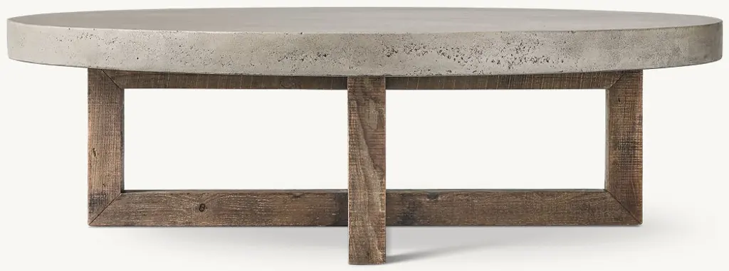 Interlocking planes of reclaimed pine support a simple concrete tabletop in our geometric collection by Thomas Bina. A play of perpendicular lines, the rustic wood frame provides a textural counterpoint to the industrial-inspired top, aged for authentic appeal. SHOP THE ENTIRE COLLECTION