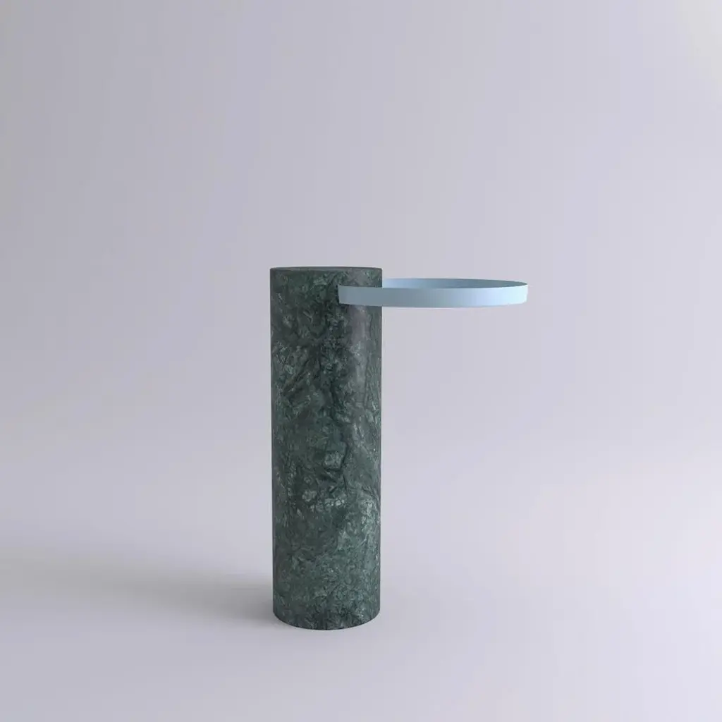 High indian green marble contemporary guéridon, Sebastian Herkner Dimensions: D 42 x H 57 cm Materials: Indian green marble, light blue metal tray The salute table exists in 3 sizes, 4 different marble stones for the column and 5 different finishes for the tray for a virtually endless number of configurations. In addition, salute can be made bespoke with special colors materials and stones. Salute is a family of tables mixing marble and metal for a high visual impact. As an occasional table, Salute is the perfect companion to your iconic armchair or next to a comfy sofa, with its clean lines and yet strong personality and impact. As a combination of tables, it is a sculptural coffee table that you can customize and adapt both in dimensions and colors. Salute is a family of guéridon tables. Each element can be used alone or combined together to play with different heights and formats as well as combinations of materials. The strong presence of the marble column is lightened by the suspended shape of the metal tray. Sebastian Herkner is the rising star of German design. He collaborates extensively with the best Italian and German brands (Moroso, ClassiCon,\.) with product that share an tasteful and rigorous simplicity, with a focus on materials and textures. This piece is attributed to the mentioned designer/maker. It has no attribution mark and no official proof of authenticity, however it is well documented in design history. I take full responsibility for any authenticity issues arising from misattribution