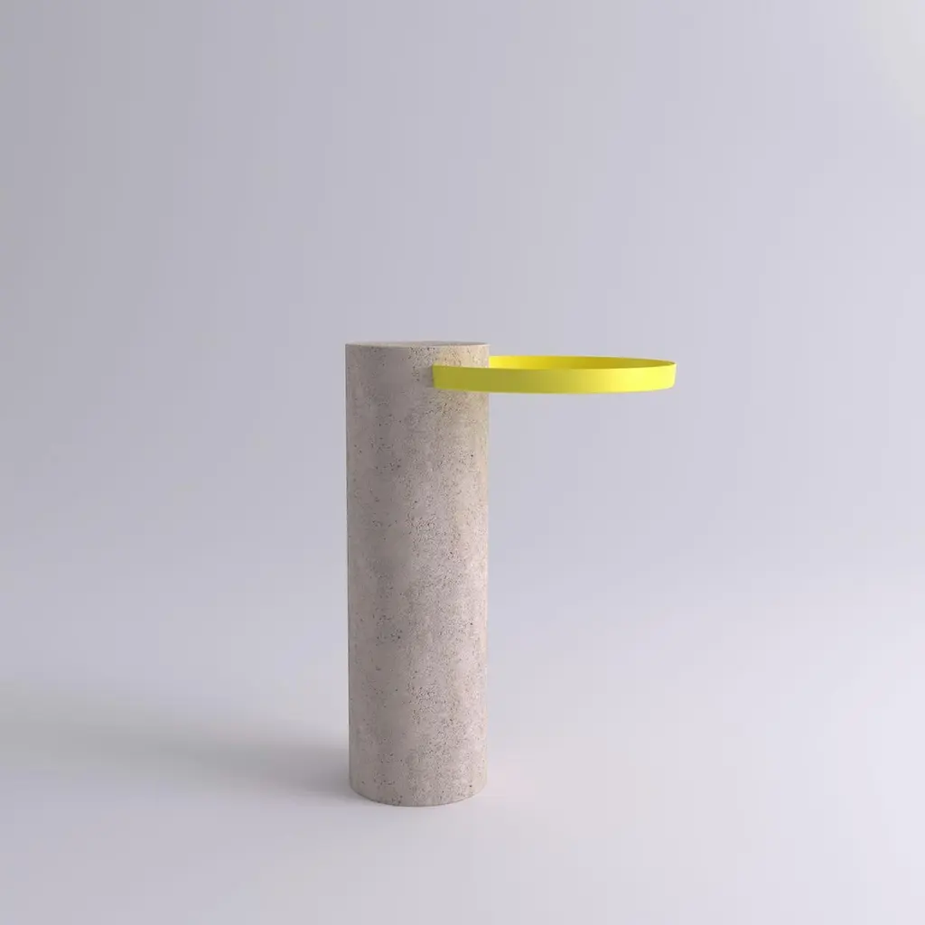 High travertine contemporary guéridon, Sebastian HerknerDimensions: D 42 x H 57 cmMaterials: Travertine stone, yellow metal trayThe salute table exists in 3 sizes, 4 different marble stones for the column and 5 different finishes for the tray for a virtually endless number of configurations. In addition, salute can be made bespoke with special colors materials and stones.Salute is a family of tables mixing marble and metal for a high visual impact. As an occasional table, Salute is the perfect companion to your iconic armchair or next to a comfy sofa, with its clean lines and yet strong personality and impact. As a combination of tables, it is a sculptural coffee table that you can customize and adapt both in dimensions and colors.Salute is a family of guéridon tables.Each element can be used alone or combined together to play with different heights and formats as well as combinations of materials. The strong presence of the marble column is lightened by the suspended shape of the metal tray.Sebastian Herkner is the rising star of German design. He collaborates extensively with the best Italian and German brands (Moroso, ClassiCon,..) with product that share an tasteful and rigorous simplicity, with a focus on materials and textures.