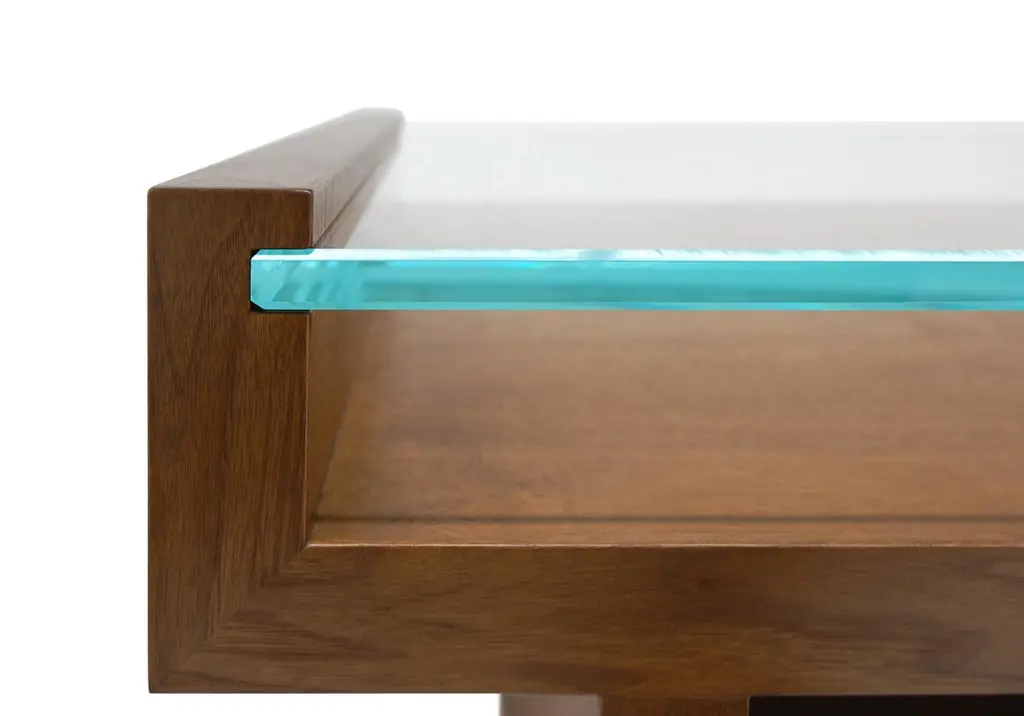 he stunning Hinge table is a harmonious balance between its sleek sophisticated glass top and the strong Walnut base into which it is set. Clean lines and strong angles of this coffee table make this a bold choice for any space.Glass: Starphire Glass,clear, Low Iron, temper