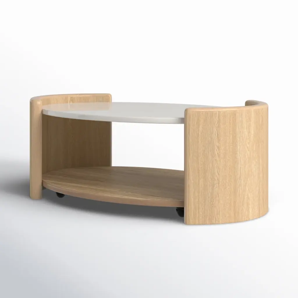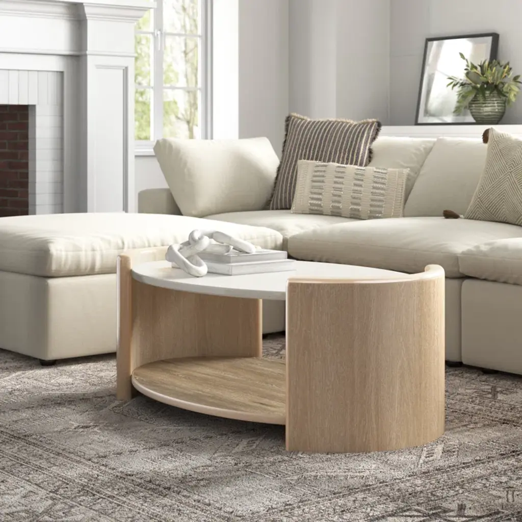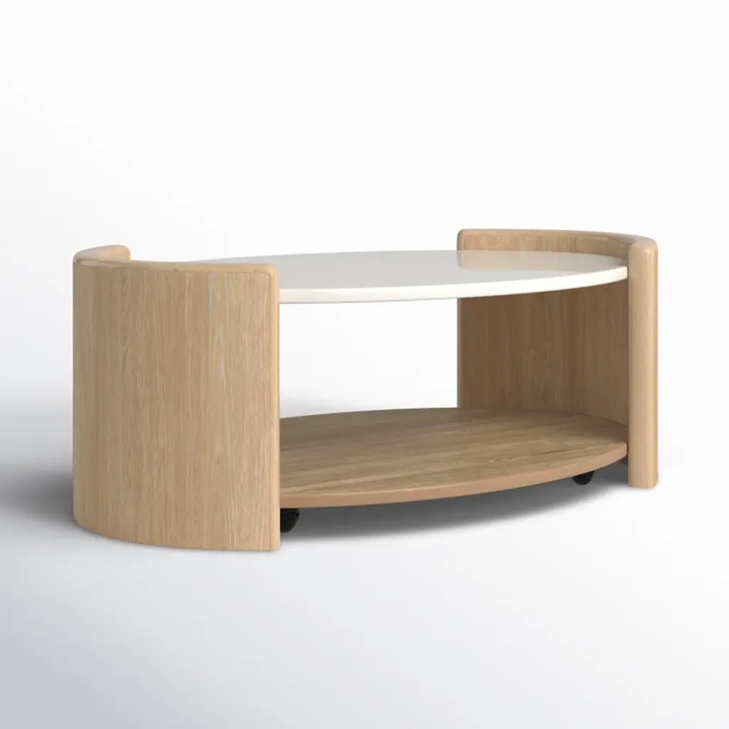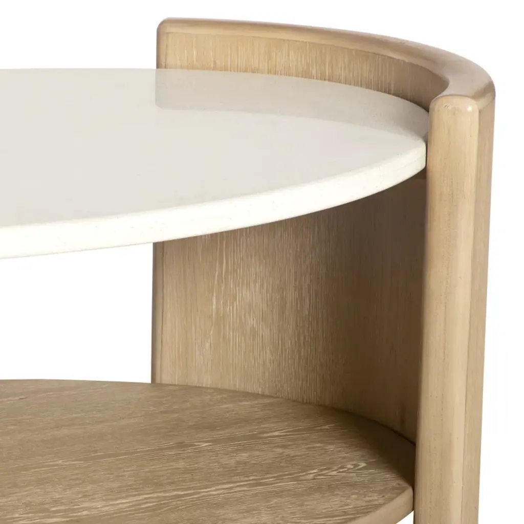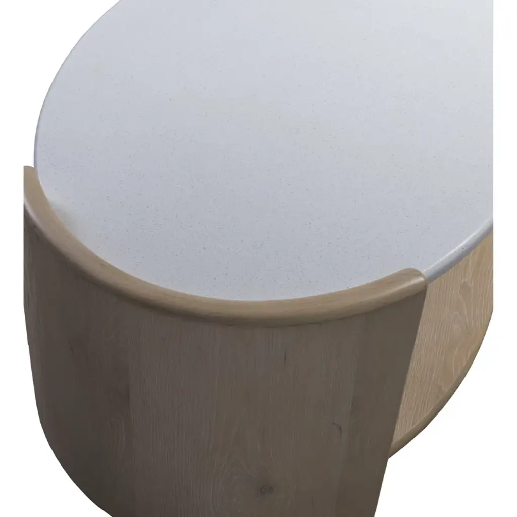 Welcome to the world of Hira, where elegance meets innovation in a harmonious blend of design and functionality. The Hira collection is a testament to refined luxury, featuring a distinctive aesthetic characterized by soft edges and a waterfall veneer layout that exudes a sense of fluidity and grace. Crafted with meticulous attention to detail, each piece in this collection is adorned with custom hardware, showcasing the commitment to exquisite craftsmanship. The Hira oval cocktail table features a modern minimalist style that makes a statement in your living room. The elegant white quartz top with two raised end panels and a spacious lower shelf, is perfect for display or use for storage. Casters provide easy movement for cleaning or rearranging. The light sand finish is accented by wire brushing for a modern, elegant look. Your purchase includes one cocktail table.