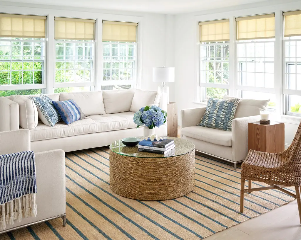 Coastal casual at its best, this round coffee table has an organically textured, woven seagrass frame, and is topped by tempered glass. Pair it up with a throw and decorative pillows from our Eden Rock collection for effortless beach chic.