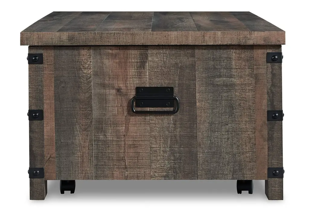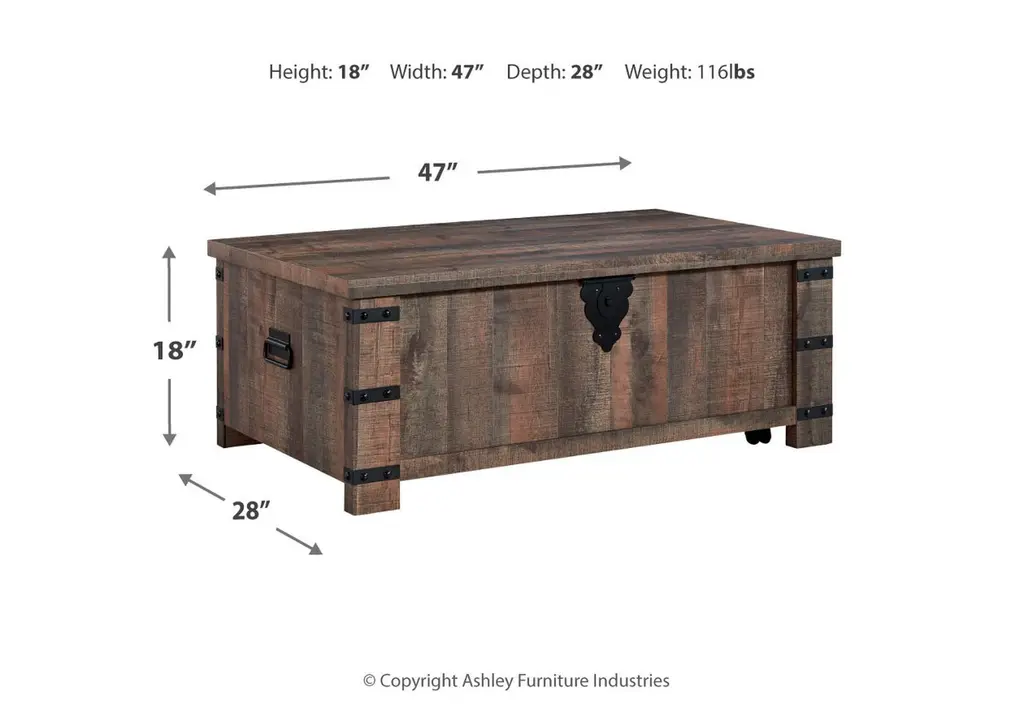 Keep your aesthetic chic and approachable with the charming Hollum coffee table. This piece has an effortless beauty, with a replicated aged barn wood pattern and matte black metal accents adding vintage-inspired elegance. Combining elements of fashion and function, the lift-top design offers a table area for dinner and a movie or working from home on your laptop. Weight 118.000 lbs. (53.1kgs.)