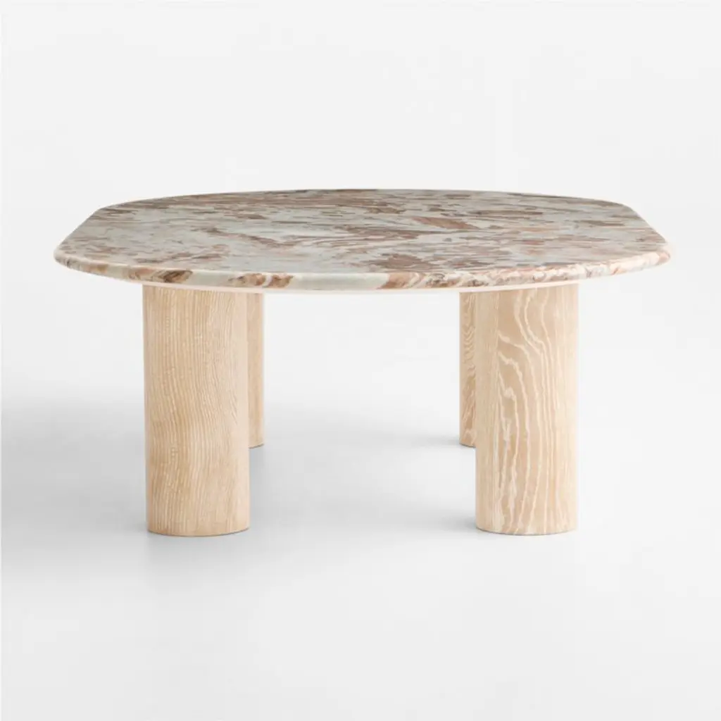 Our Homage coffee table pays tribute to the beauty of natural materials with bold proportions and simple shapes. Styled with smooth bullnose edges, the top showcases the uniquely varied earth tones and dramatic veining characteristic of Toronto marble. Oversized cylindrical legs complement with the lively grain of white oak, enhanced with an ivory ceruse finish.