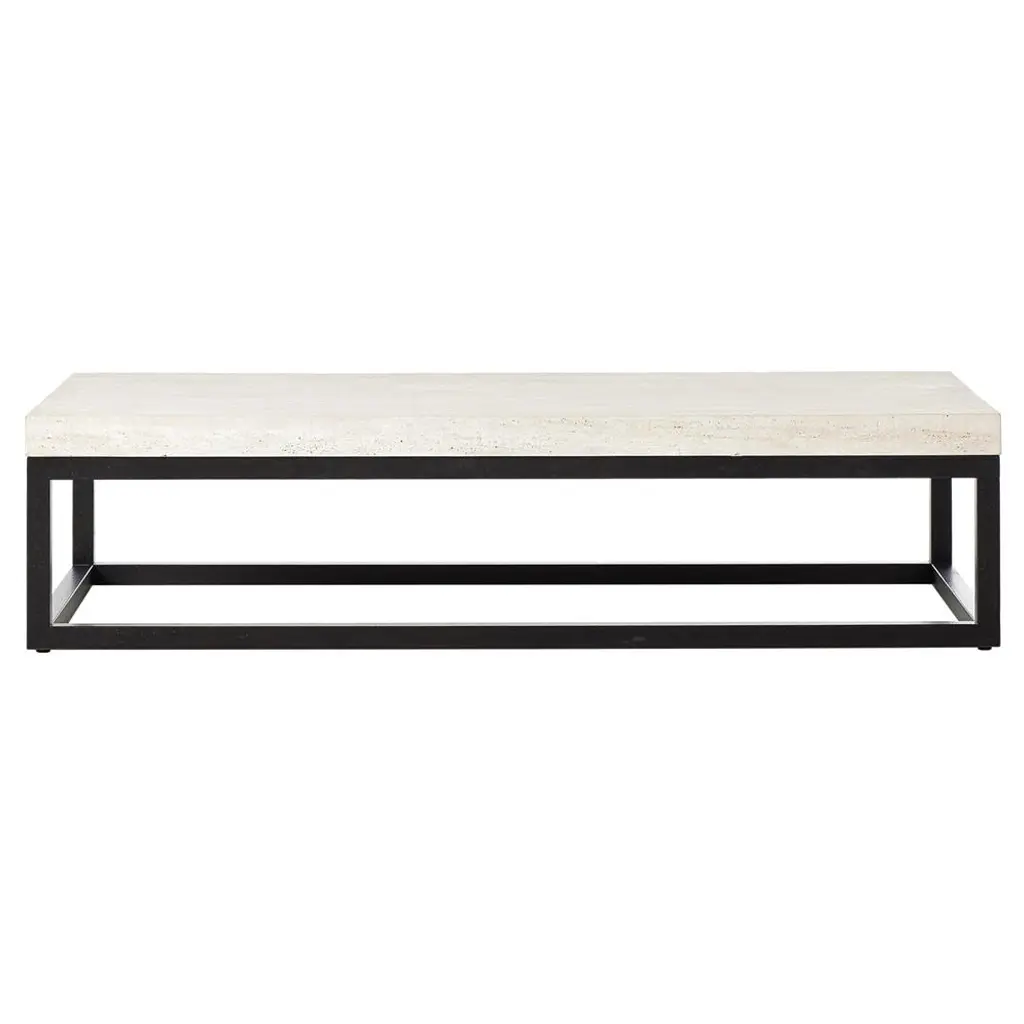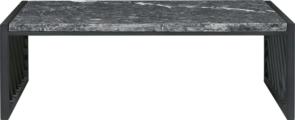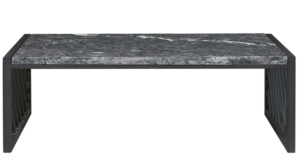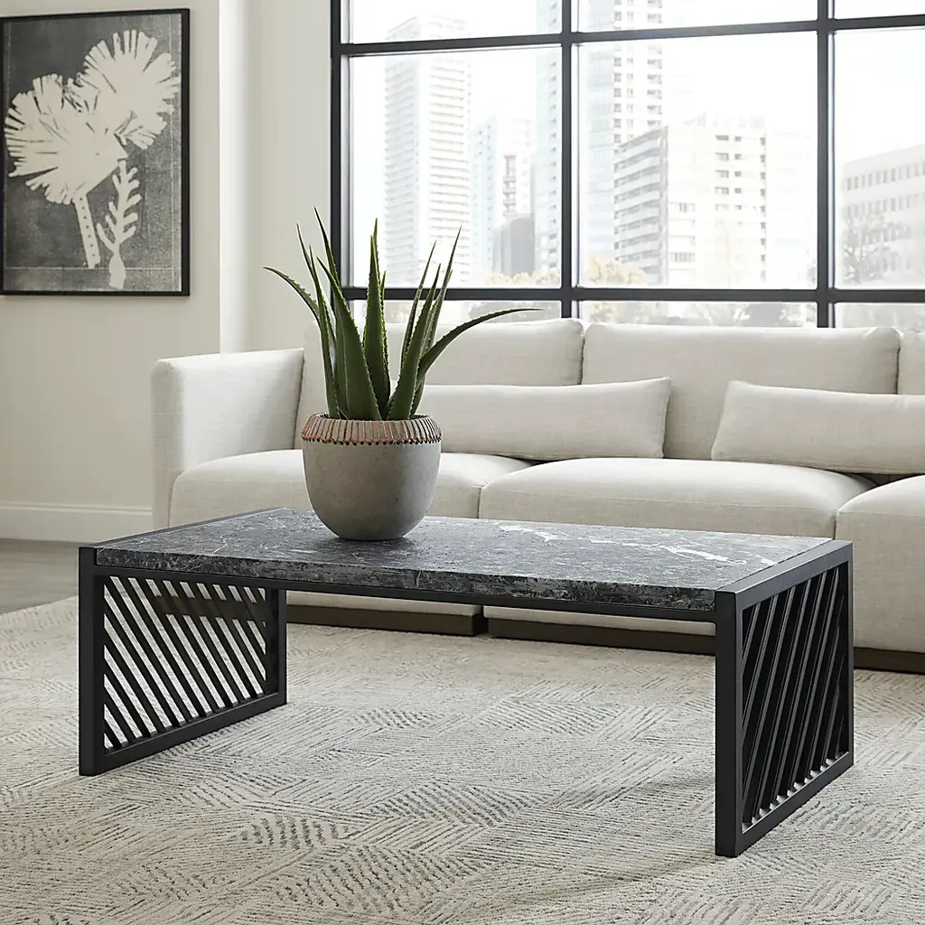 Striking and modern, the Honeywares black cocktail table combines contemporary style with natural elegance. An organic gray and white stone top displays a natural pattern with subtle color variations, creating a unique and sophisticated look. A dark metal base featuring an airy diagonal slat design creates a sense of movement, setting this table apart as a statement piece. Its sleek design contributes to the modern aesthetic, providing a clean, industrial feel.