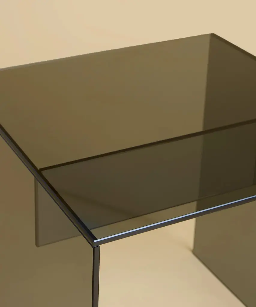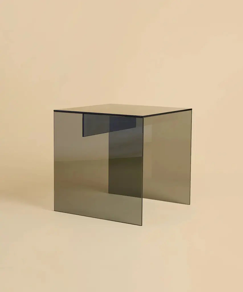 The Honshu coffee table is made entirely of smoked glass. The top is square on the side 17.7 inches, while the base is obtained by gluing three slightly beveled 6mm thick slabs.Founded by Emanuela Terraneo and Alessandro Pozzi, Lebanto designs and produces modern and refined furniture in Cantù, Italy.
