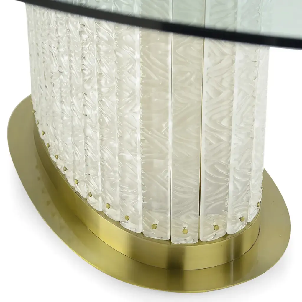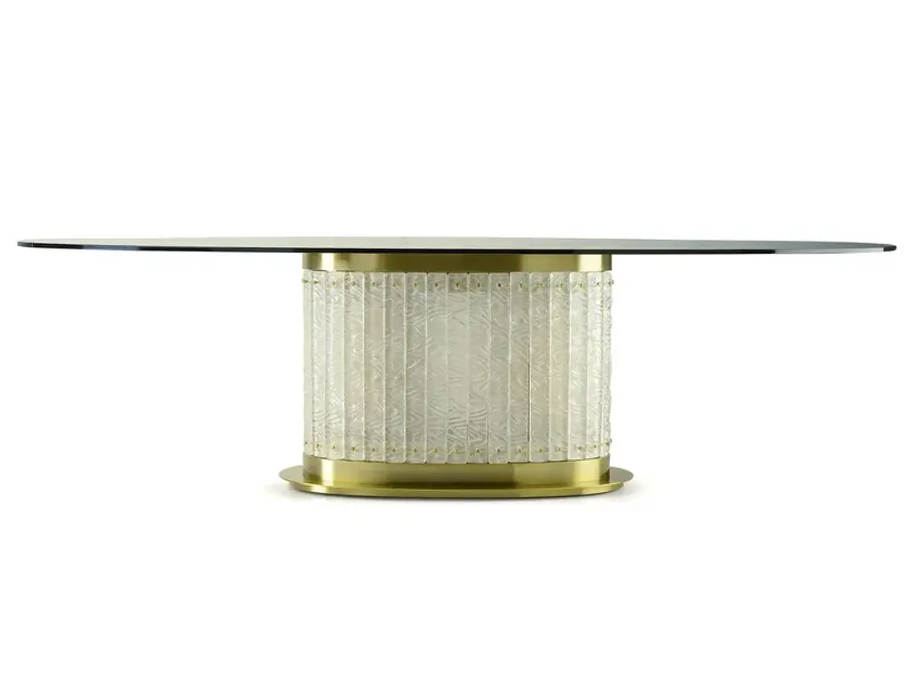 Elegant and refined Howard oval coffee table with metal structure and decorative glass elements. The table top is fixed with a plate bonded with UV system.Howard - Tables with structure made in thick metal flat bar, with brushed brass finishing. Tops available in many different combination like veneers, marbles and parchment. The curved junctions and the functional details add elegance to these magnificent pieces of furniture.