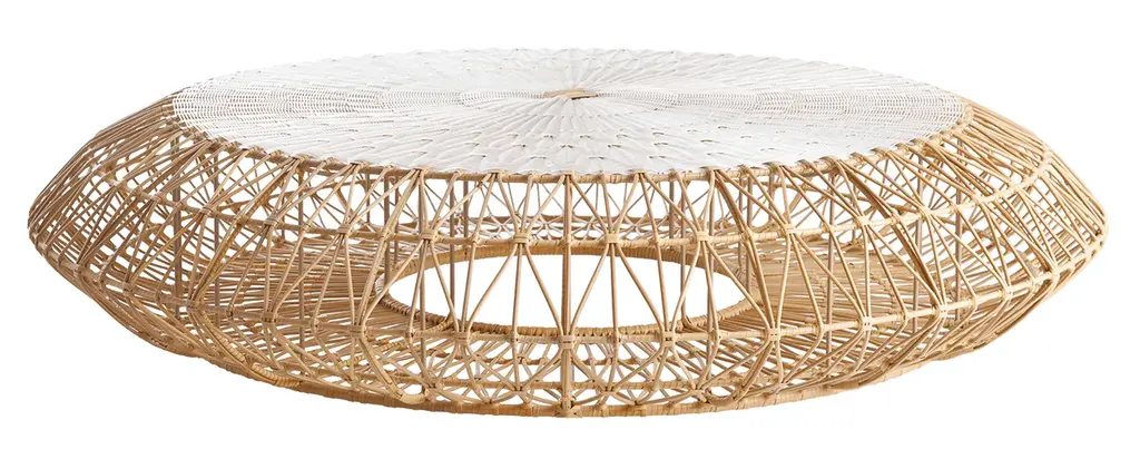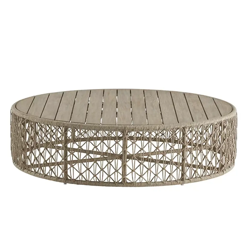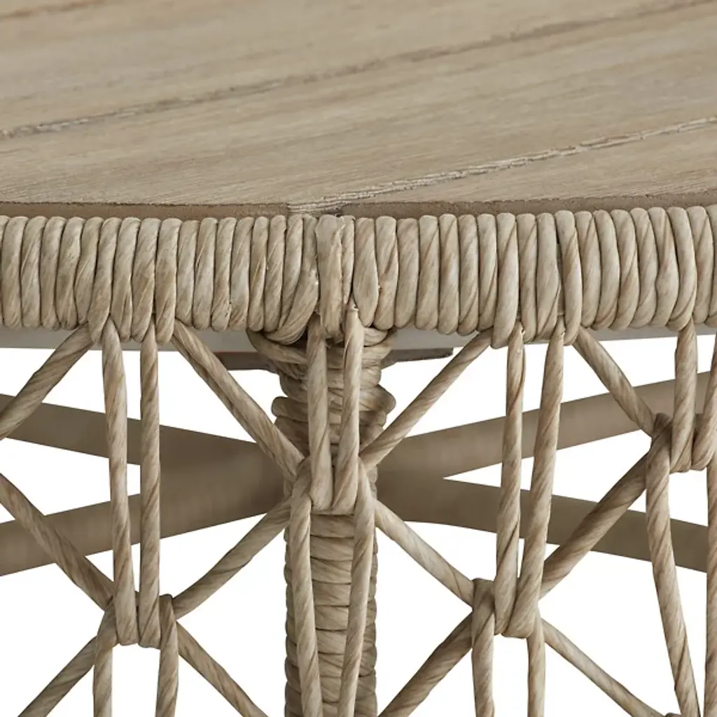 The Hugo Outdoor Coffee Table from Arteriors brings abstract allure to outdoor lounge spaces through its drum-shaped design that combines multiple materials beautifully. Twisted synthetic rattan in dune weaves the lattice base, creating intriguing patterns of light and shadow that change throughout the day. Matching teak wood tops this coastal-inspired yet contemporary piece, providing a sturdy surface for entertaining needs. Position this table to anchor seating groups on decks or use it in garden settings where the natural materials complement surrounding plantings.