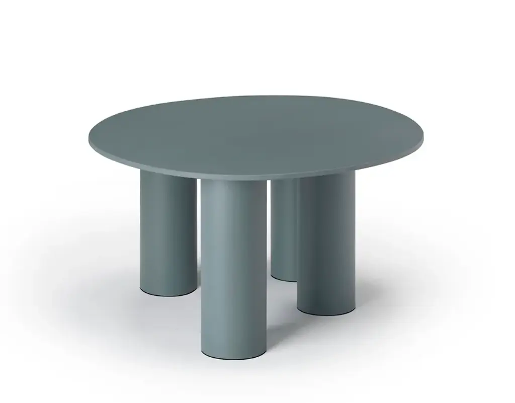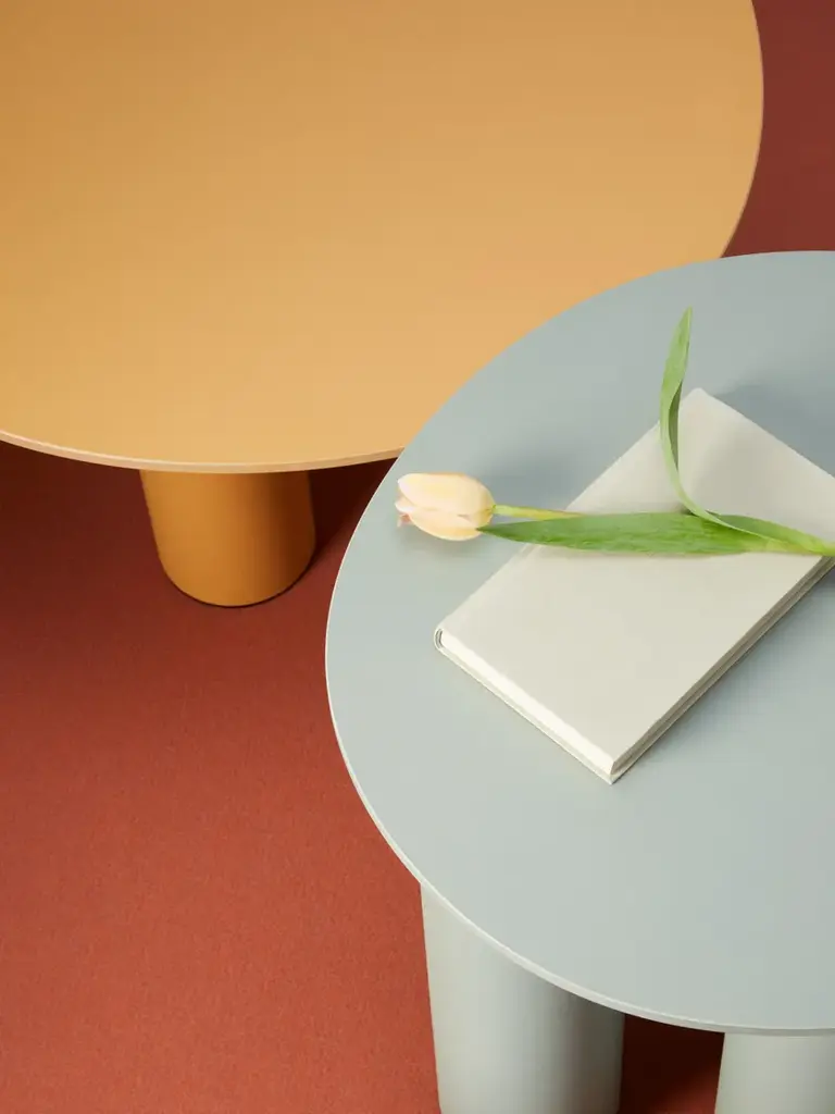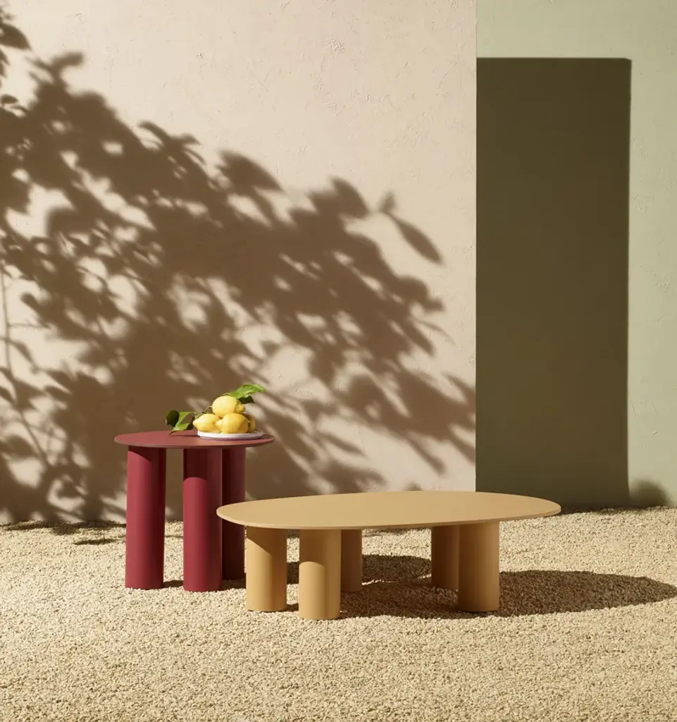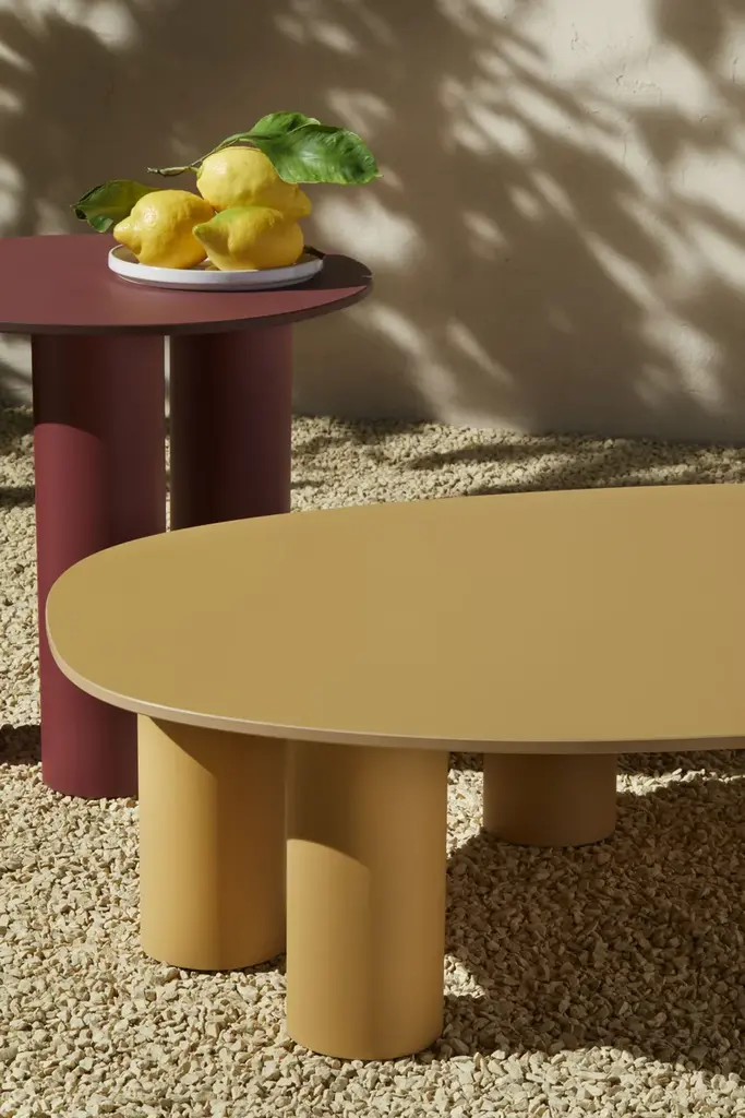The result of playful experimentation, the Hyppo coffee-table family is designed for outdoor use but adapts with versatility to indoor spaces. The inspiration, clear even from the name itself, is linked to the morphology of the hippopotamus and is revealed in the design of the aluminium legs, large and sculptural. The contrasting top, made with coloured paste laminate, stands out instead for its thin profile and deliberately irregular contour, reminiscent of the animal’s body. Available in different diameters and heights, Hyppo’s variants can be combined to recreate islands of coffee tables, welcoming the placement in any corner or living room. The colour palette, which includes ochre, crimson, quartz green, and petroleum green in a matte finish, also promotes the complementarity of the combination.The family of coffee tables Hyppo comes from the desire to offer a series of extremely versatile and functional complements, designed for outdoor use but also suitable for indoor spaces, and also from a formal, at times playful, experimentation that characterizes the project.