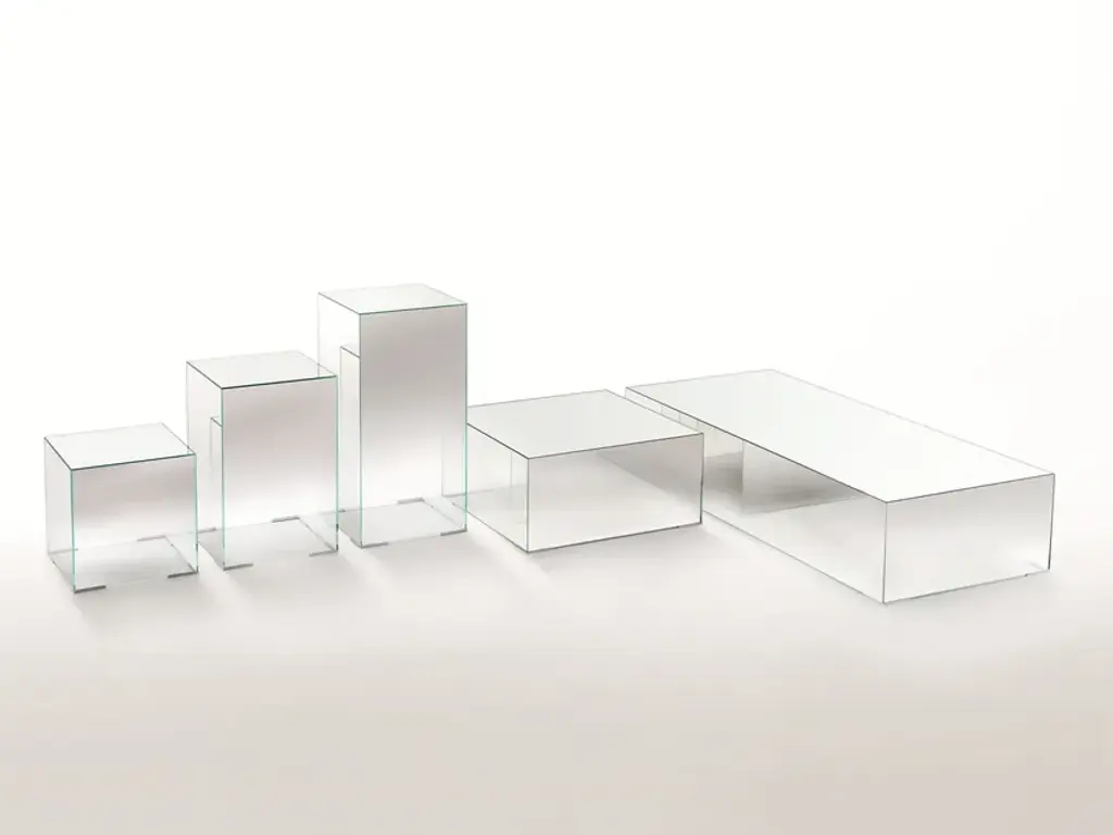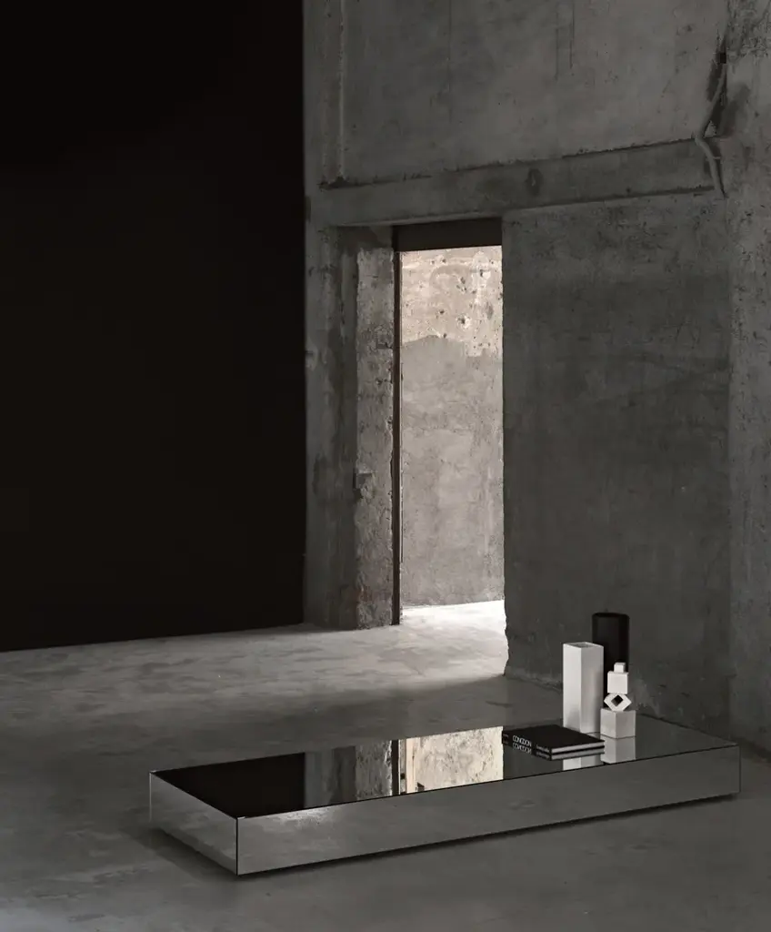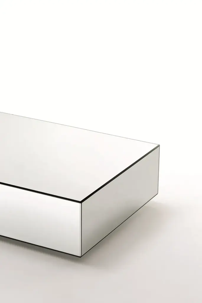 I Massi is a low table with wheels in a parallelepiped form and with monolithic figure, obtained by gluing 45° chamfered mirror slabs.Attention, to avoid that the cleaning detergent seeps between the mirror slabs causing the oxidation of this one, it is recommended not to spray it directly on the mirror but to dampen the cloth used.