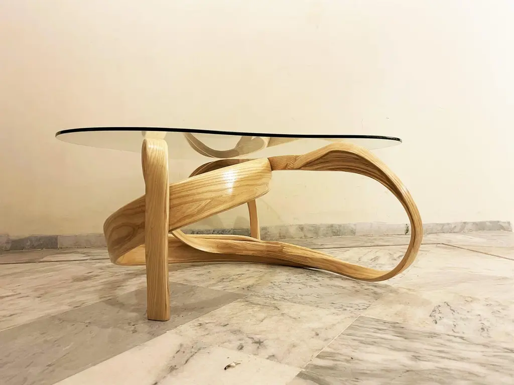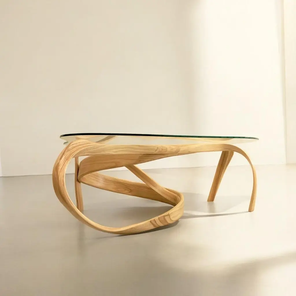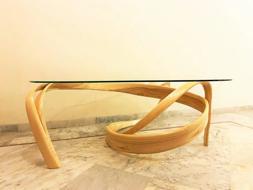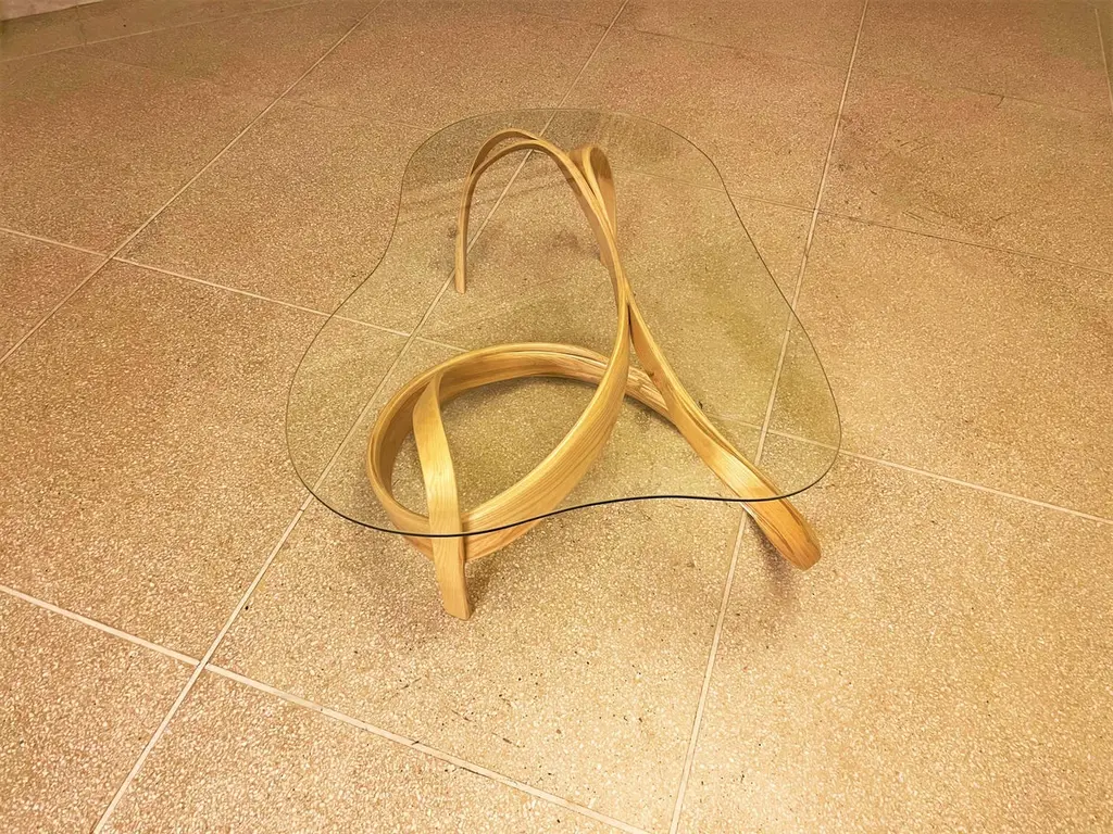 The 101 cocktail table is crafted by bending ash wood to create the base frame which balances a clear glass top which is curved to complement the frame's curves. The continuous flowing wood expands in width; giving the piece a mesmerising element.Other points worth knowing:- All of our designs are fully customizable; design, dimensions and finishes.- The design may vary slightly from the piece in the pictures since each piece is handmade.- You can choose from an array of finishes.