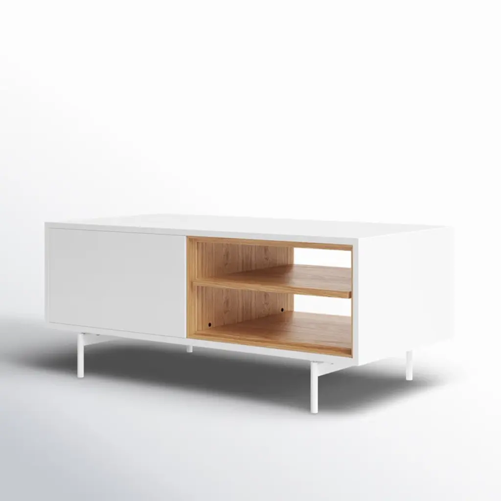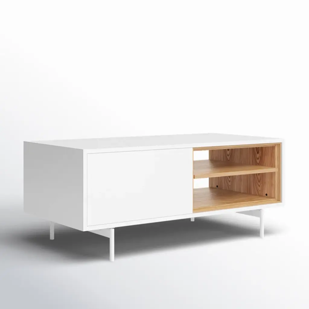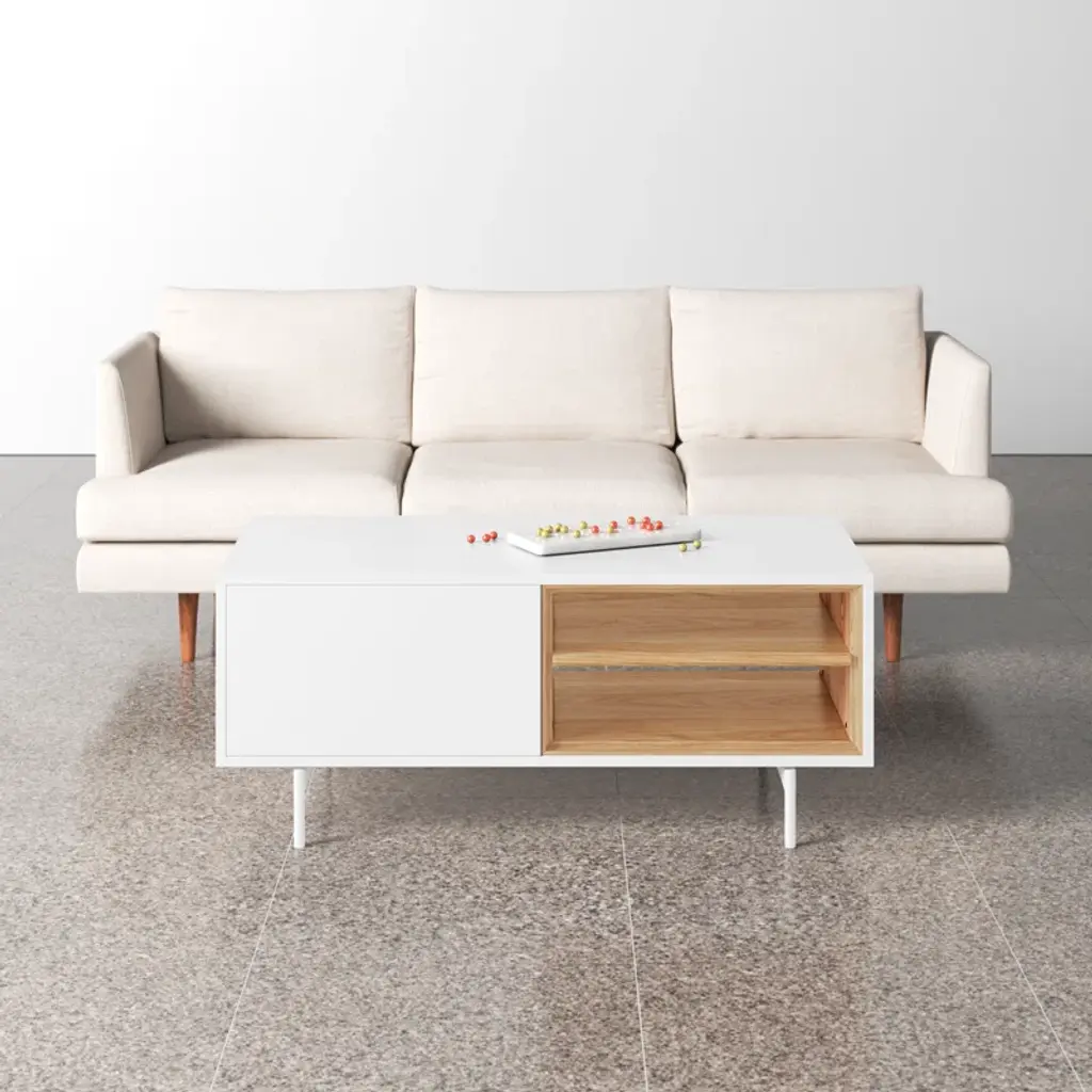 With its pared-back silhouette and mix of white + woodgrain finishes, this coffee table draws inspiration from bright + streamlined Scandi style. Two cabinets tuck away clutter while open shelves keep remotes or reading material in easy reach. Slim legs of powder-coated steel lighten the look.
