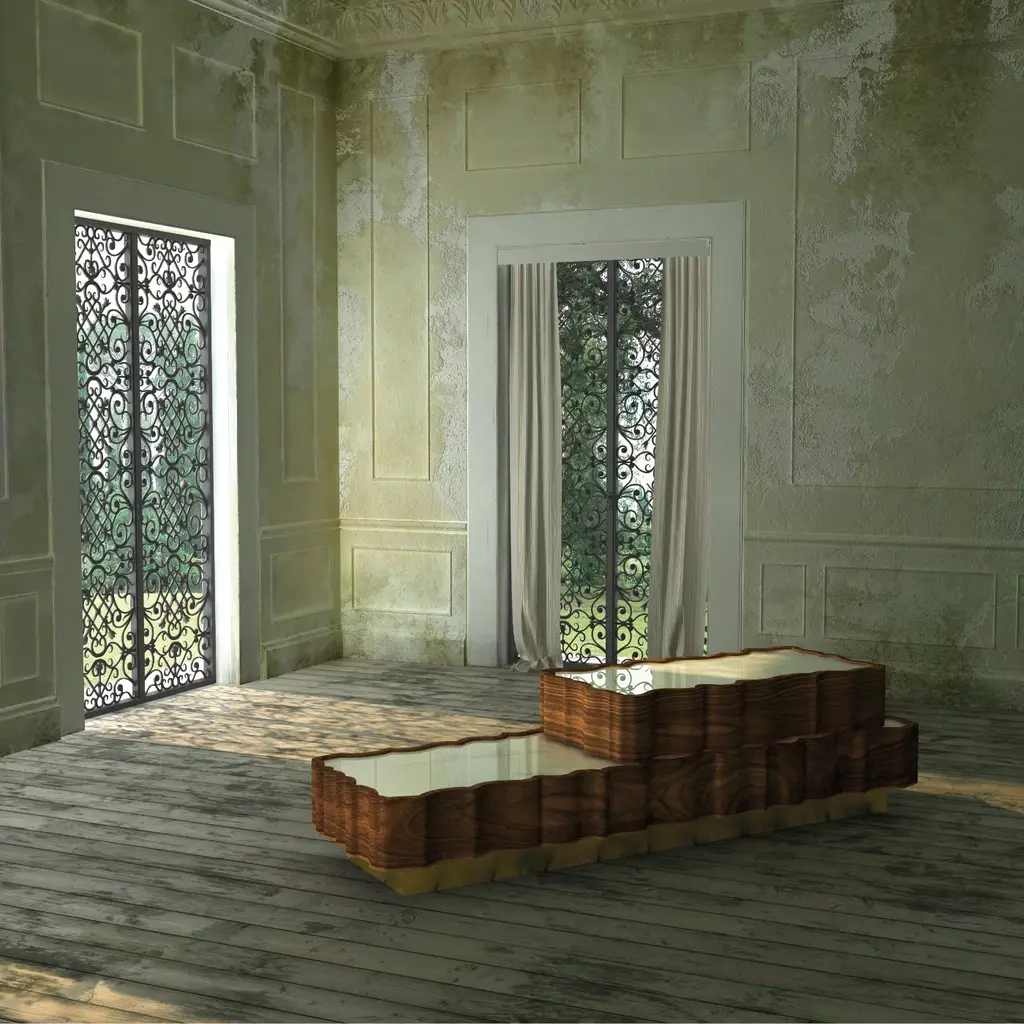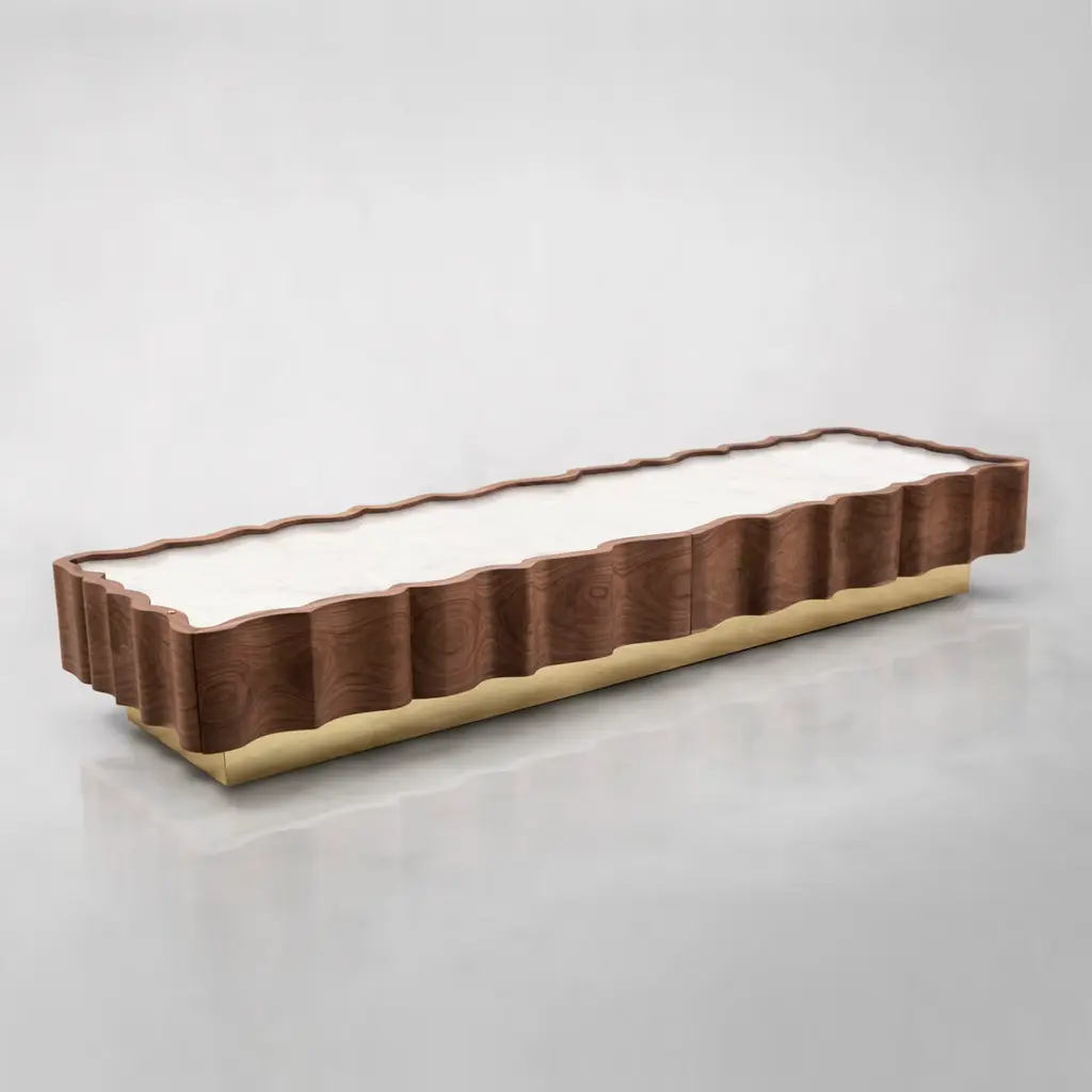 Il Pezzo 2 Coffee Table has a classic, sinuous shape. The top is a beautiful slab of white Carrara marble, the base is made of brass, while the walnut, made from a single piece, shows its magnificent grain.In each piece a small brass cylinder carrying a personalized number attests to its uniqueness and authenticity.This piece can be custom made to desired size and finish.