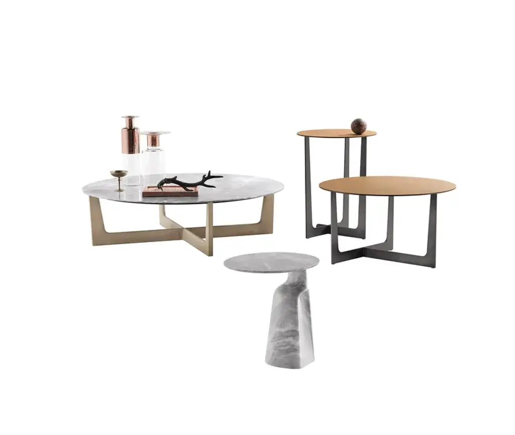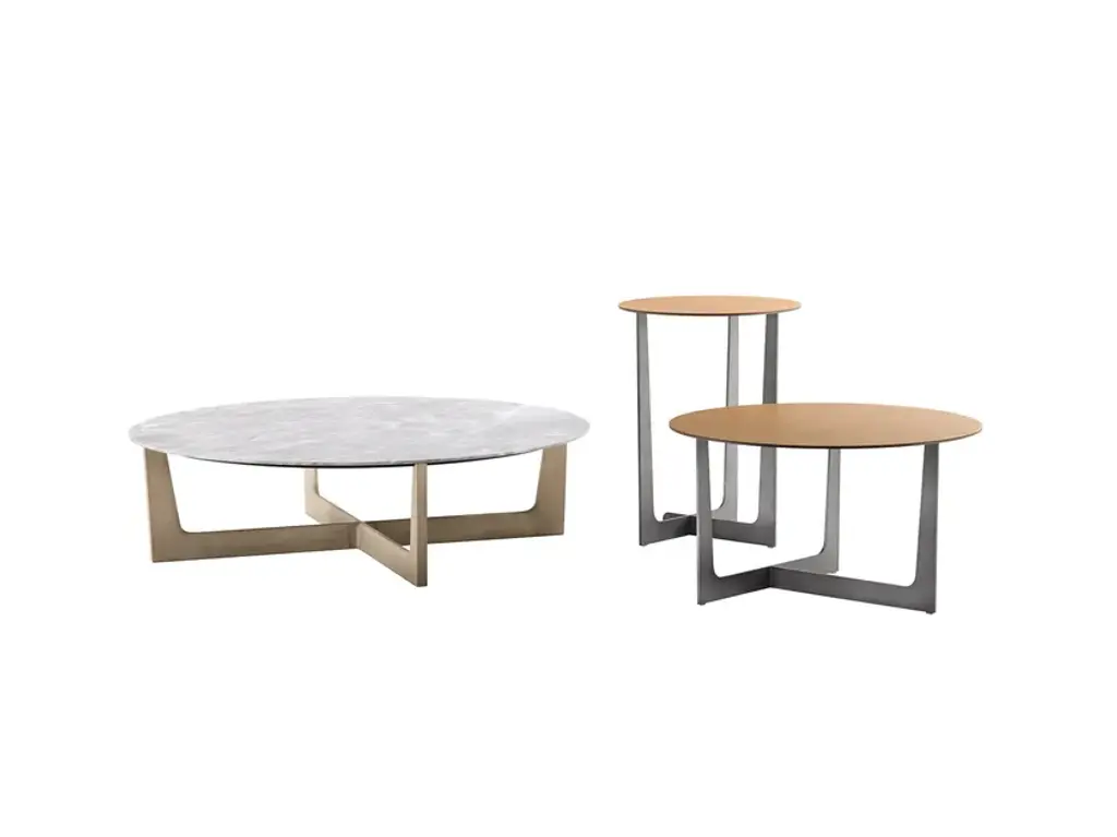 With this range of side tables, Jean-Marie Massaud has designed three collections in one. The Ilary collection comprises different heights, shapes and constructions. It is a language of finishes and materials, used to create effects and combinations which are always diverse and coherent.Solid ash base for the two rectangular and round low tables, both 35 cm tall. The top is in semi-glossy Grigio Roma marble, chosen by Poltrona Frau for its particular warm grey grain which harmonises with the Havana brown ash finish of the wood. The smooth design has rounded corners and softened lines both on the top and the crosspieces. The lower shelf is in black painted birch plywood.Material variations in the two round side tables, available in heights of either 48 or 68 cm. The polished and burnished steel base has a natural simplicity and a fluidity of colour which combine elegantly with the top upholstered in Cuoio Saddle Extra leather. The lower table is also available with a Grigio Roma marble top. In all of the versions the lower shelf is in black painted steel. The monolithic side table that completes the collection is sculpted entirely from Grigio Roma marble with a semi-glossy finish. The top is round and the 55 cm high support is characterised by a striking handle-groove that makes it easy to move the side table. An invisible steel frame unites the two elements.