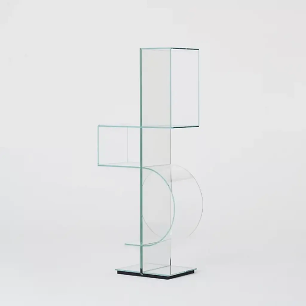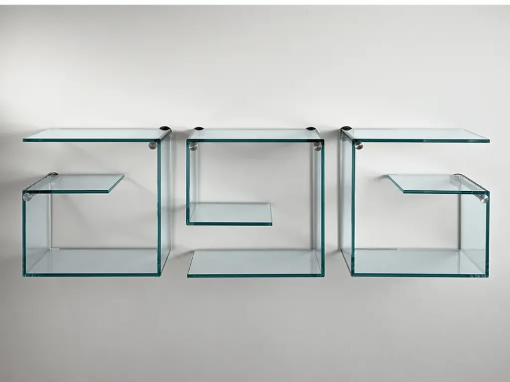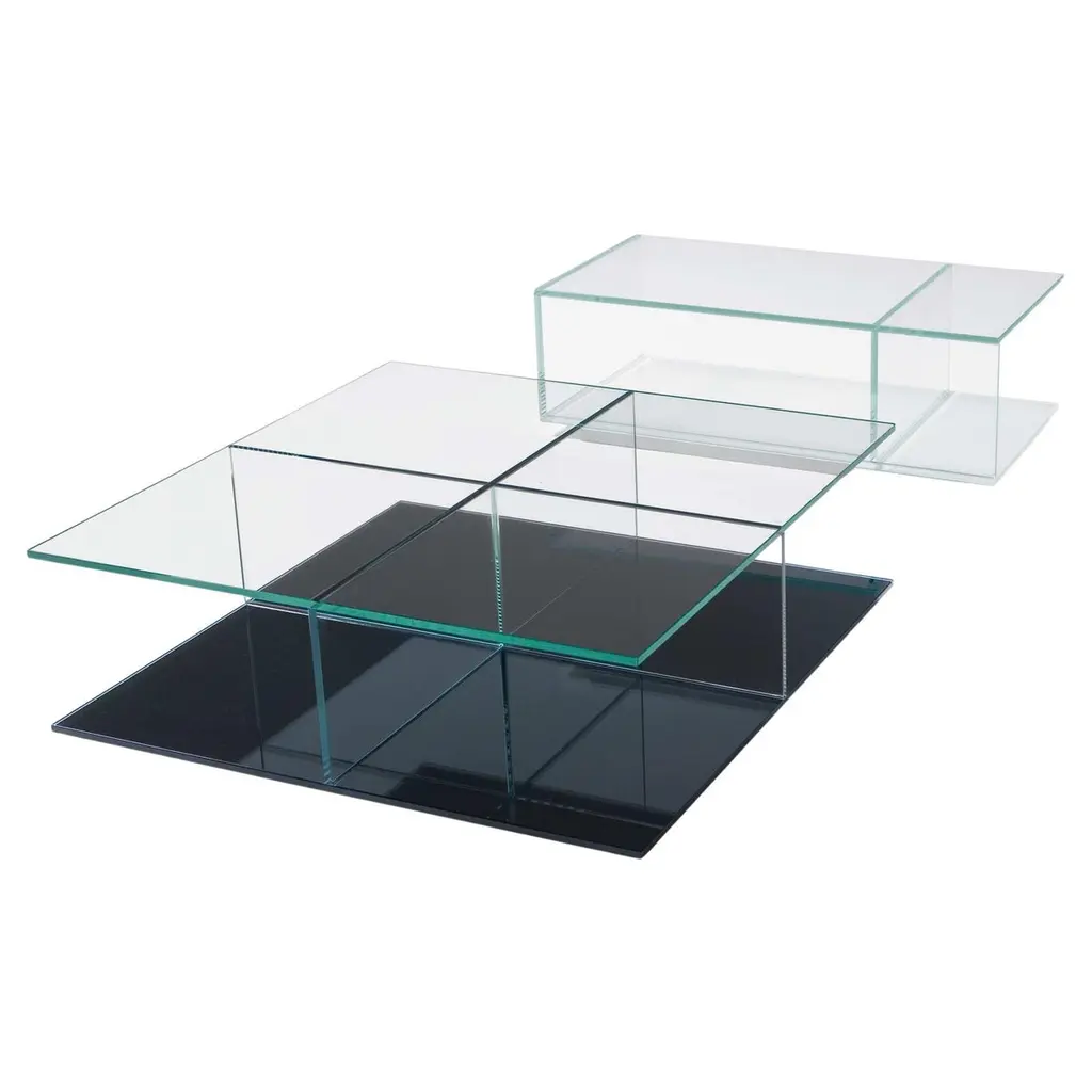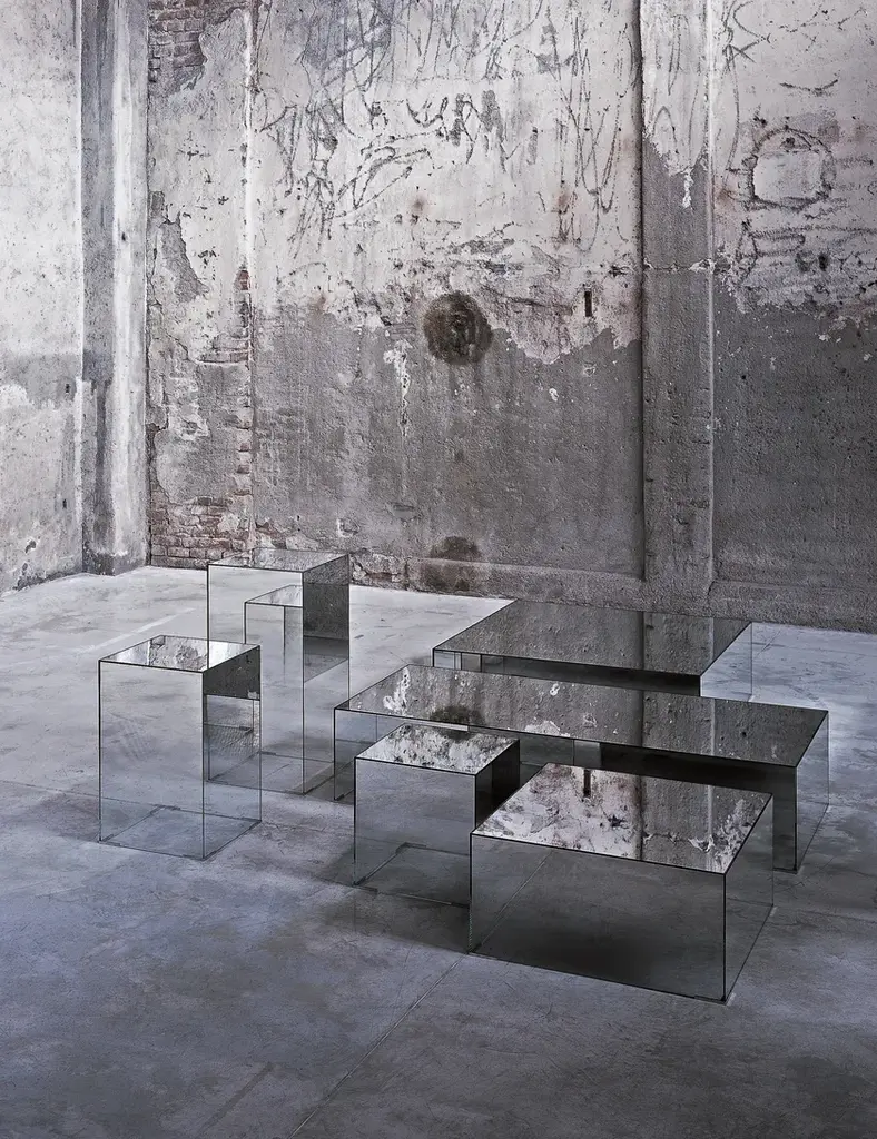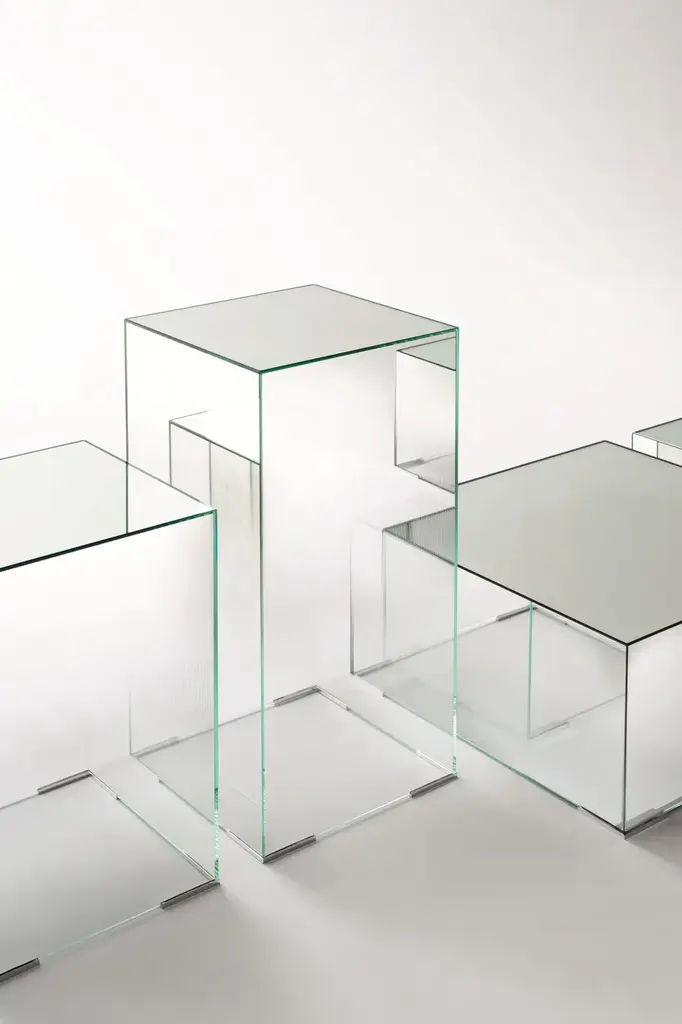 Illusion is a series of parallelepiped shaped low tables with mirroring top and degrading shading mirroring sides. Realized in extralight glass, glued 45°.Attention, the fading mirror can present small irregularities that can not be a reason for complaint.