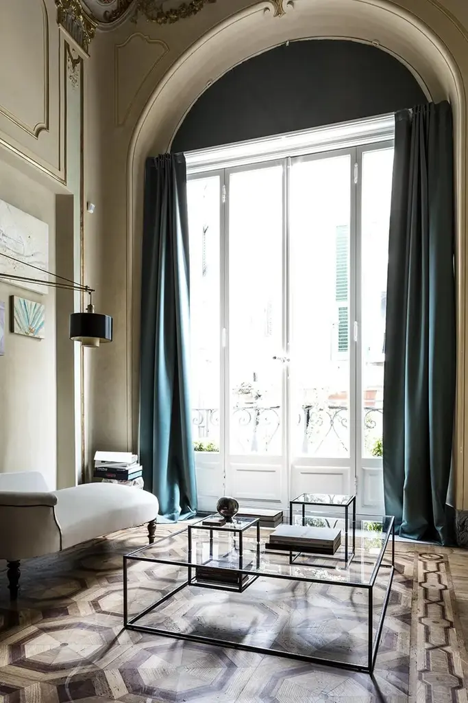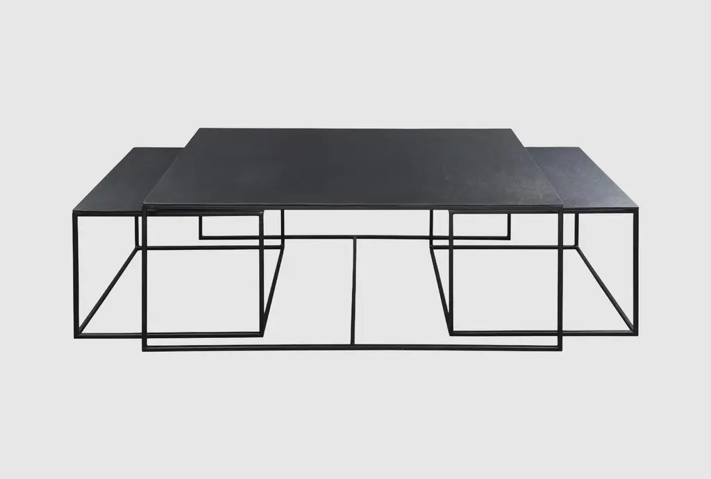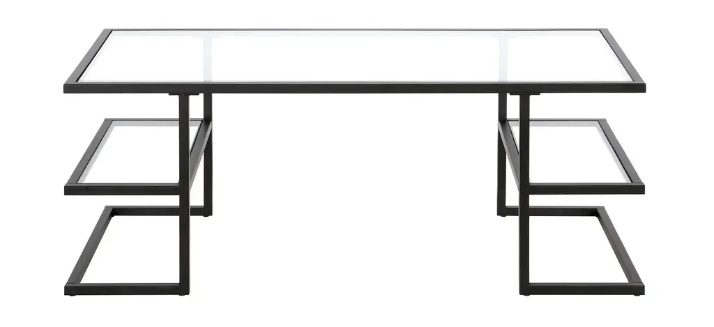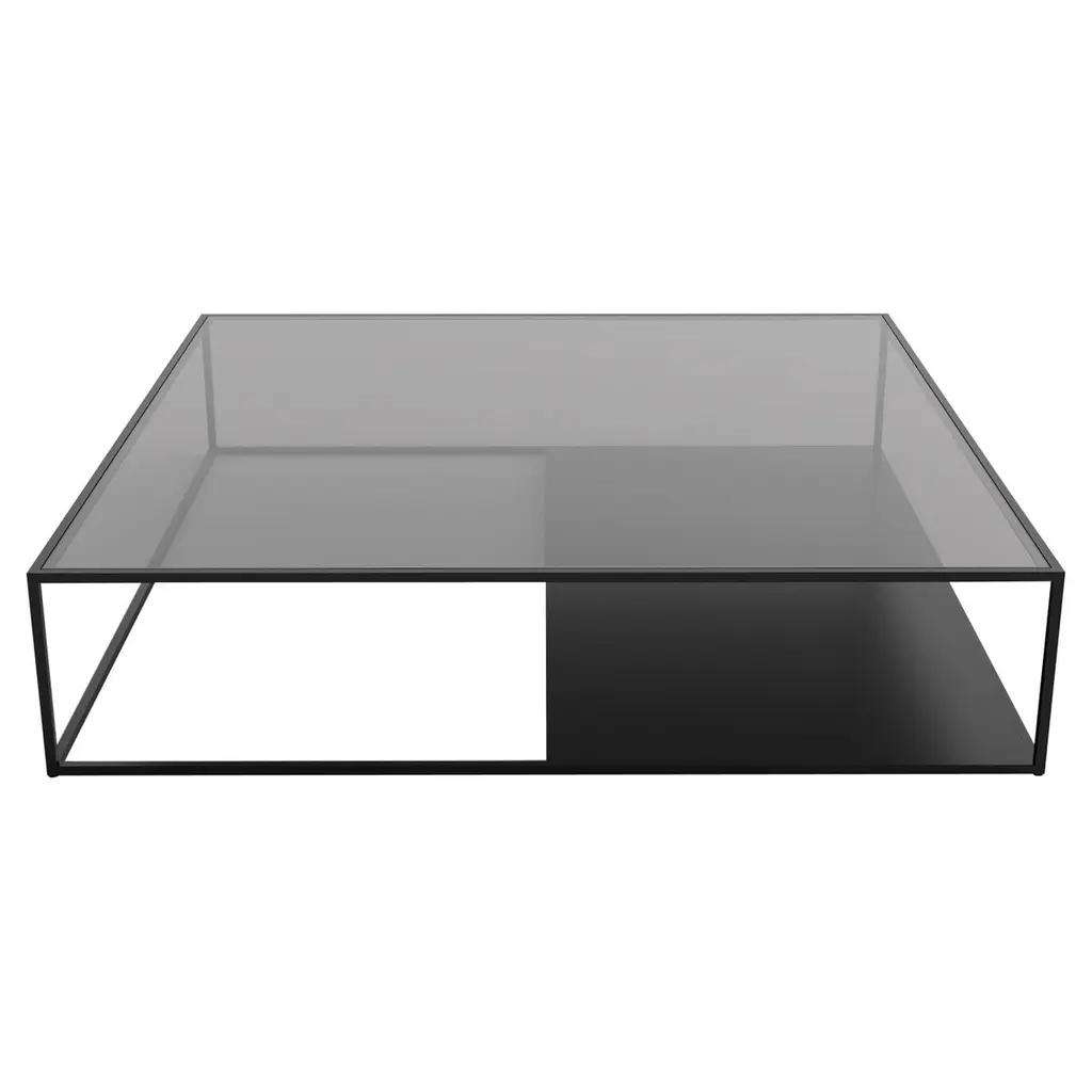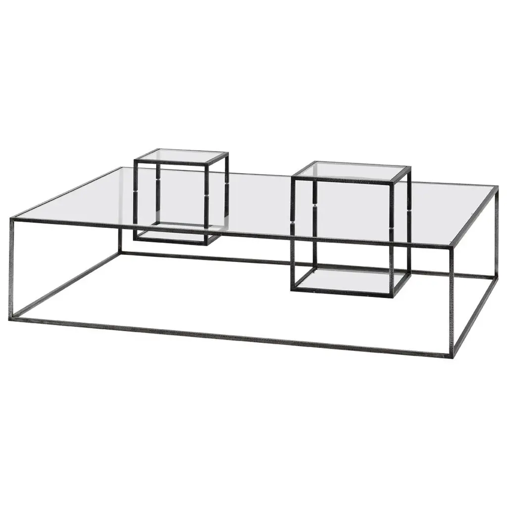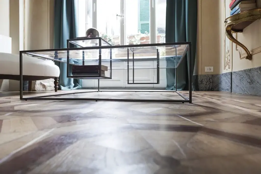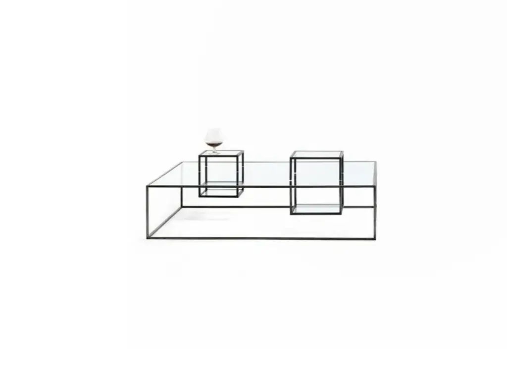 Illusioni is a rectangular coffee table with a black painted metal structure and tempered glass tops.