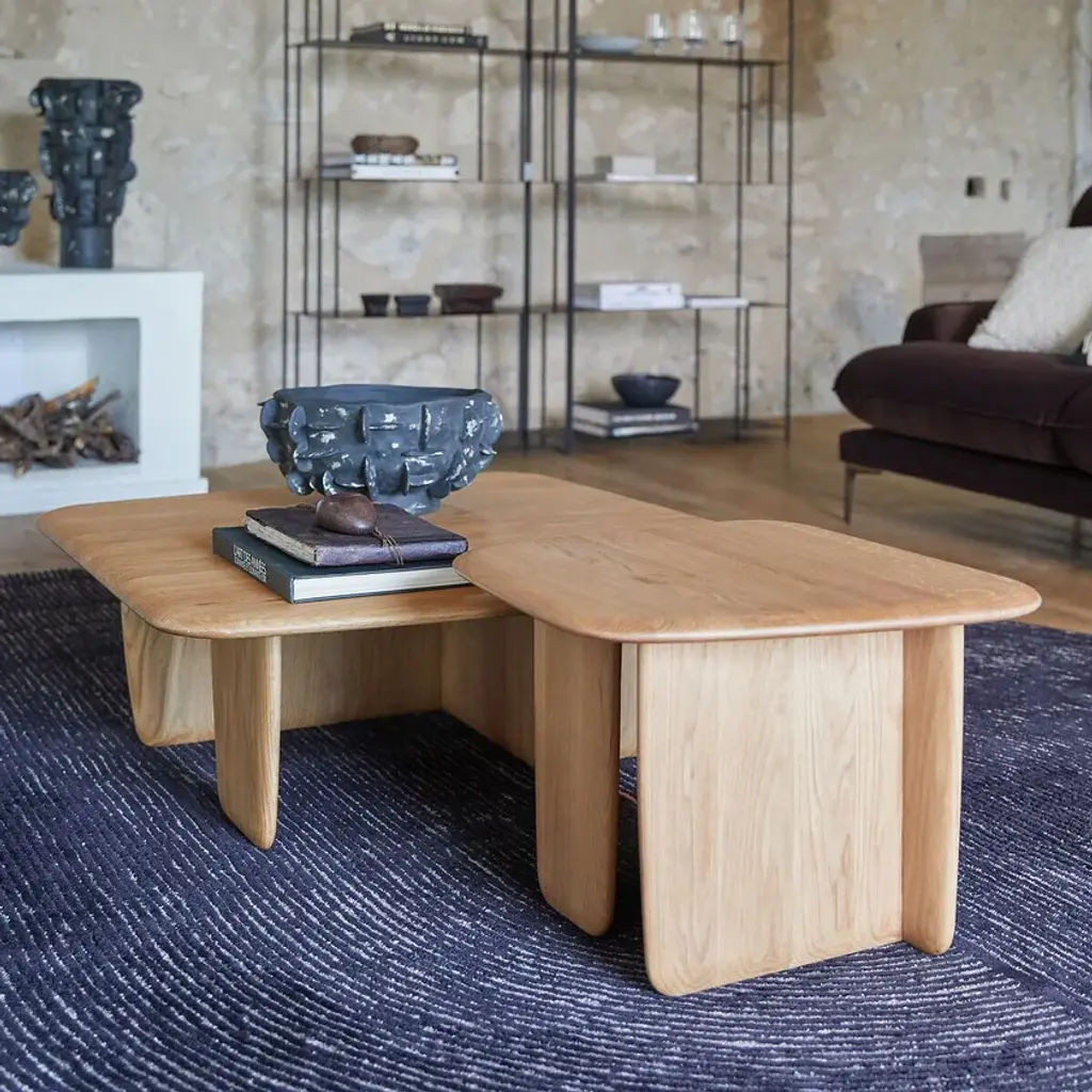 Iloss low tables, when the nobility of solid oak is combined with the softness of an organic design. The top with bevelled edges and the base inspired by aeroplane wings show a line that is as contemporary as it is timeless. Stackable low tables by AMPM.Solid oak, polyurethane finish. FSC® certified mixed woodOrganically shaped top with bevelled edgesAeroplane wing-shaped base