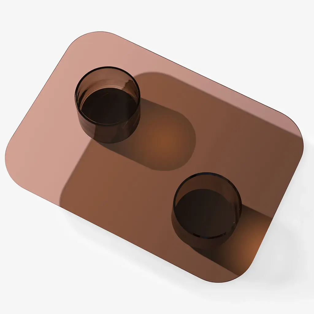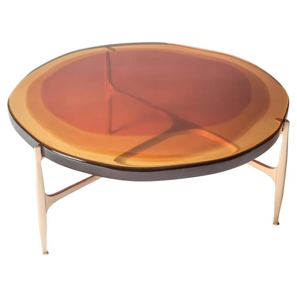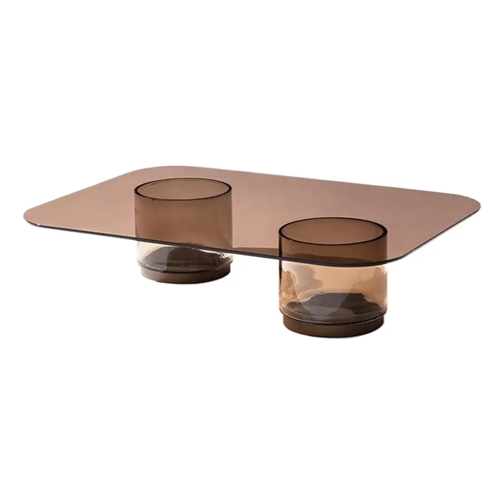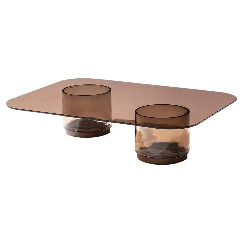 The embodiment of masterful artisanal craftsmanship, this extraordinary coffee table strikes with its sleek, delicate, and sophisticated lines. Charmingly stunning, a bronzed glass top boasting a rectangular shape with rounded corners to see through its bottom, showcasing two magnificent cylindrical supports crafted of Vitroplex. Customizable upon request, please contact the Concierge for details.