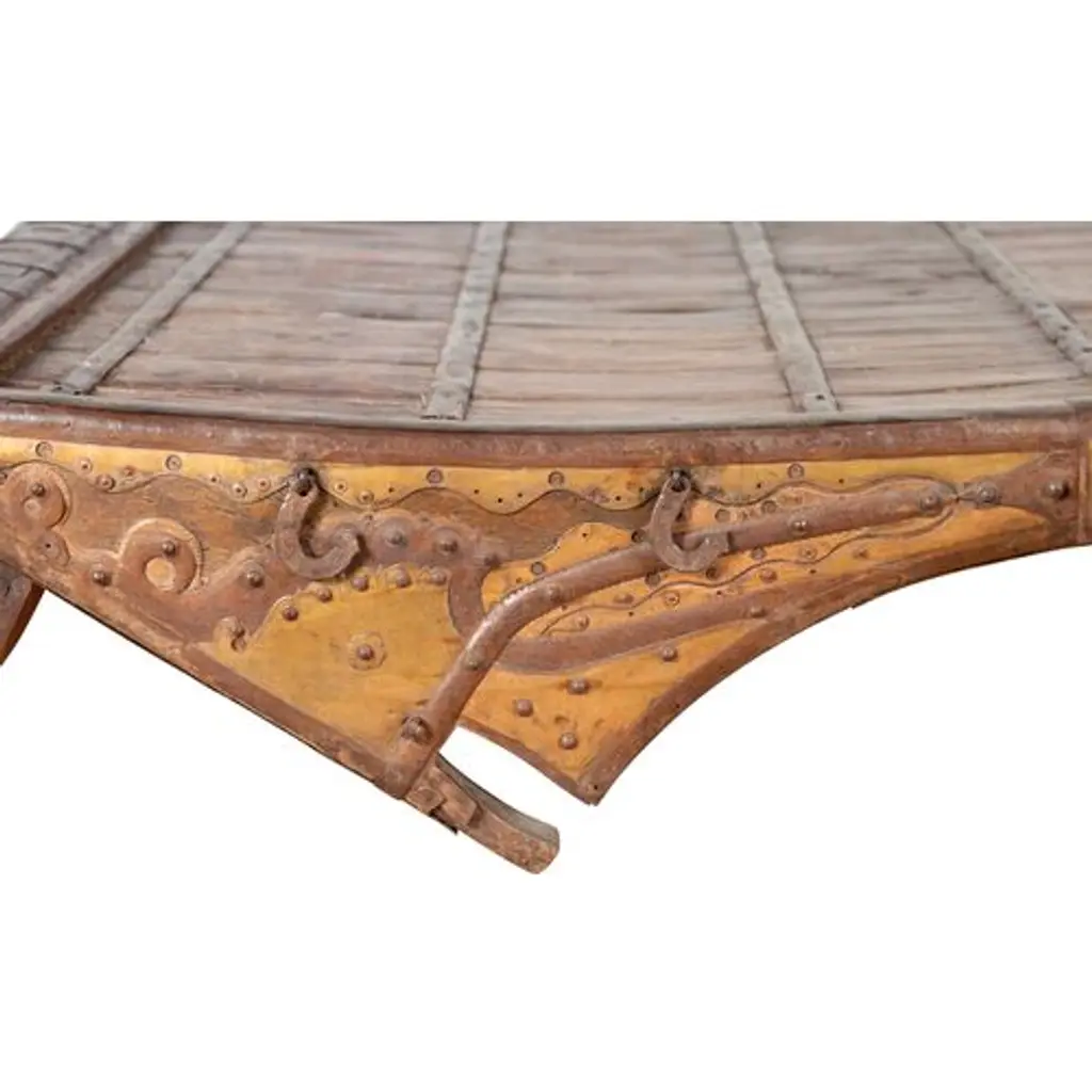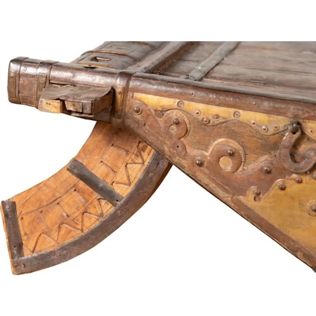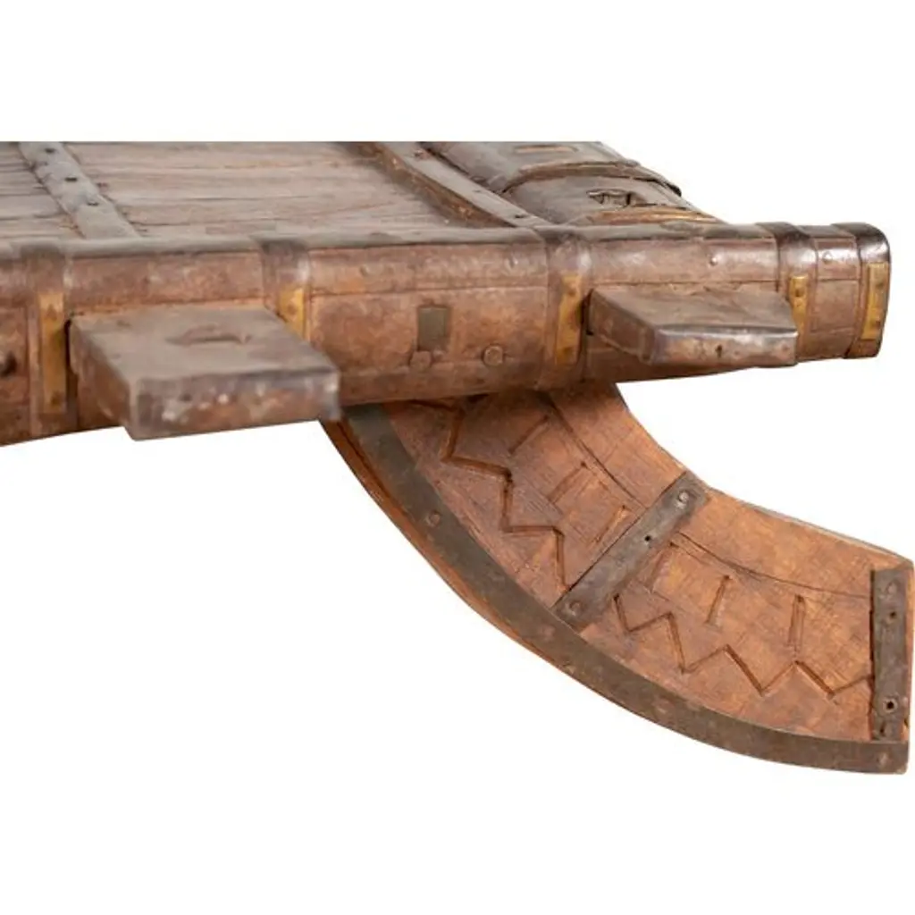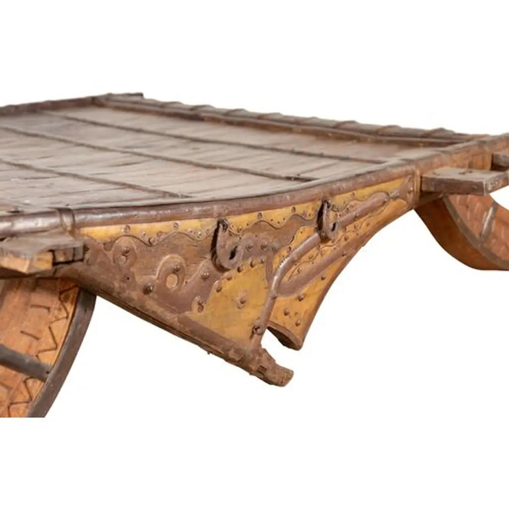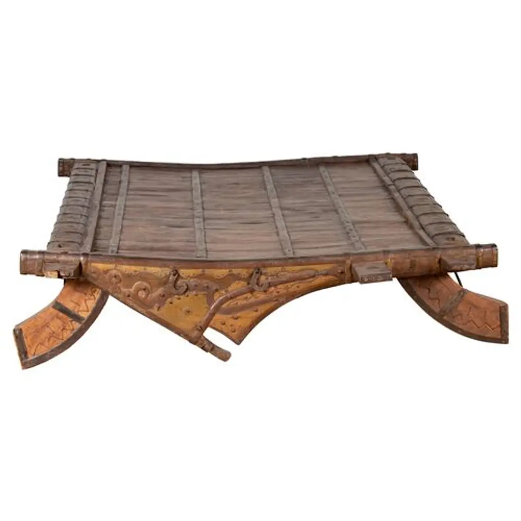 An Indian wood ox cart with metal accents from the 19th century, made into a coffee table. Perfect to be used as a coffee table, this conversation piece is an old wooden ox cart accented with metal accents and raised on curving legs. Whimsical in nature, its rustic looking rectangular wooden top shows a succession of metal braces, while the sides are adorned with square motifs pierced in their center. The front is adorned with scrolls and hooks that focus our attention.