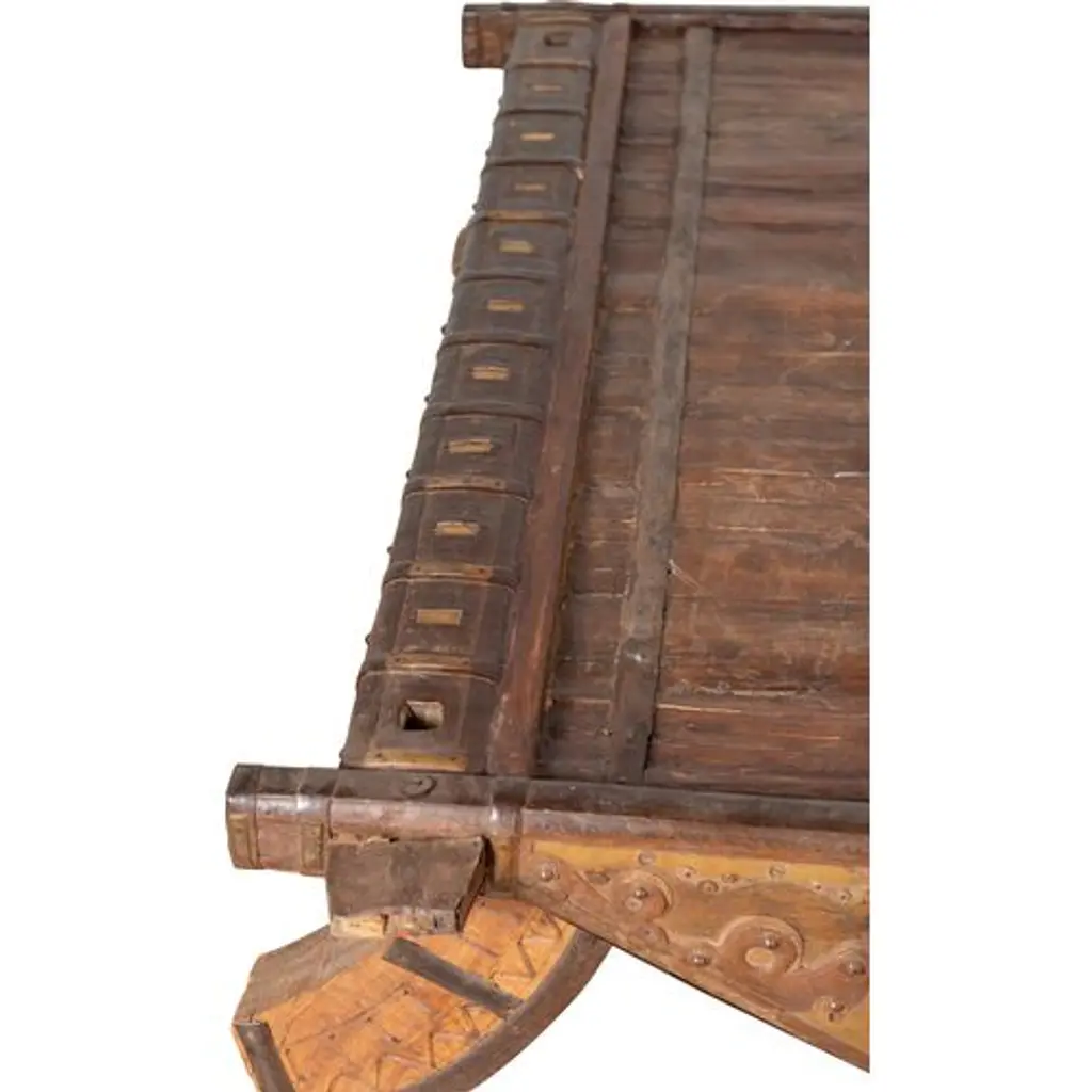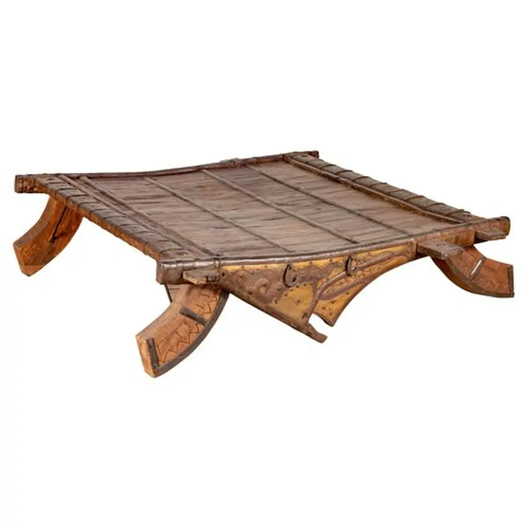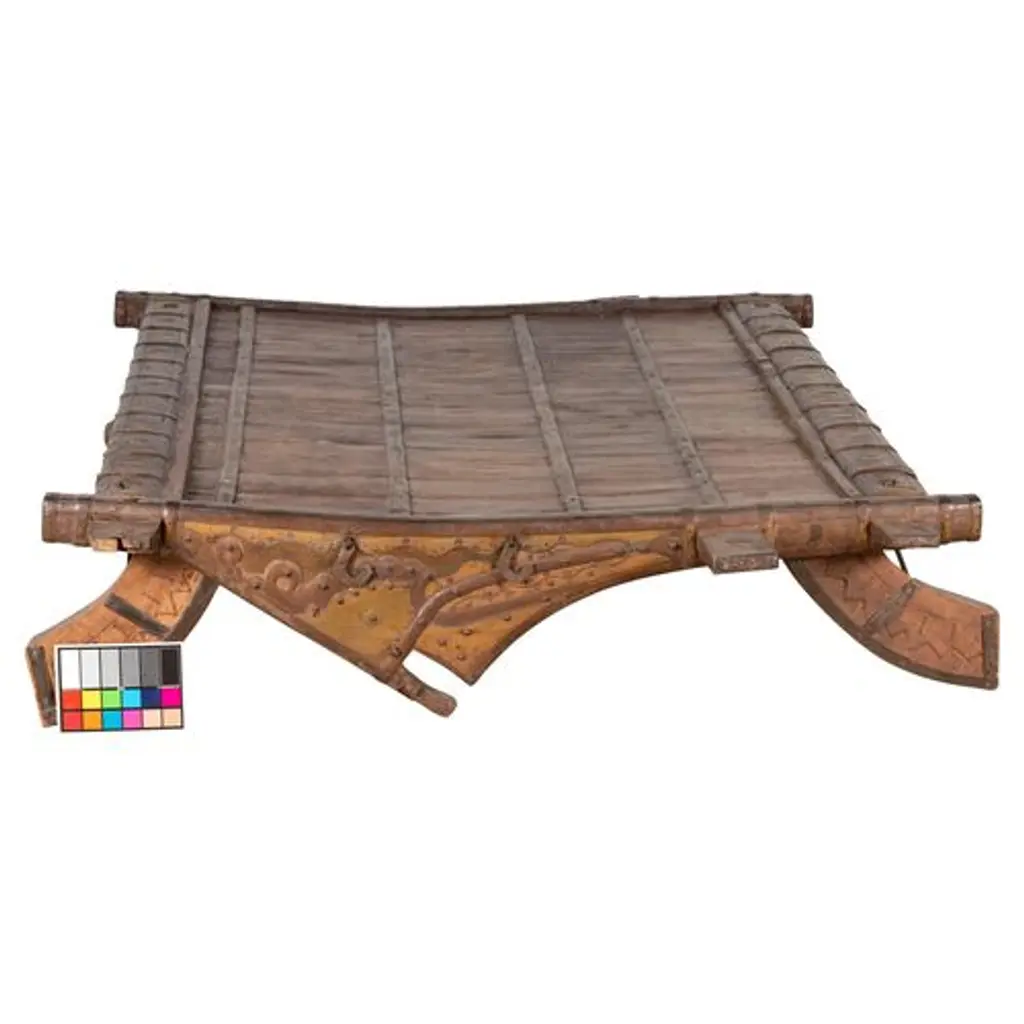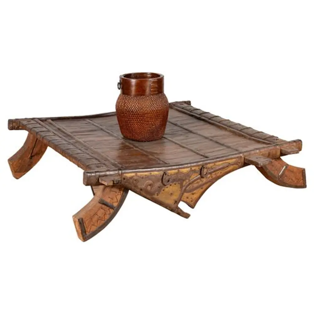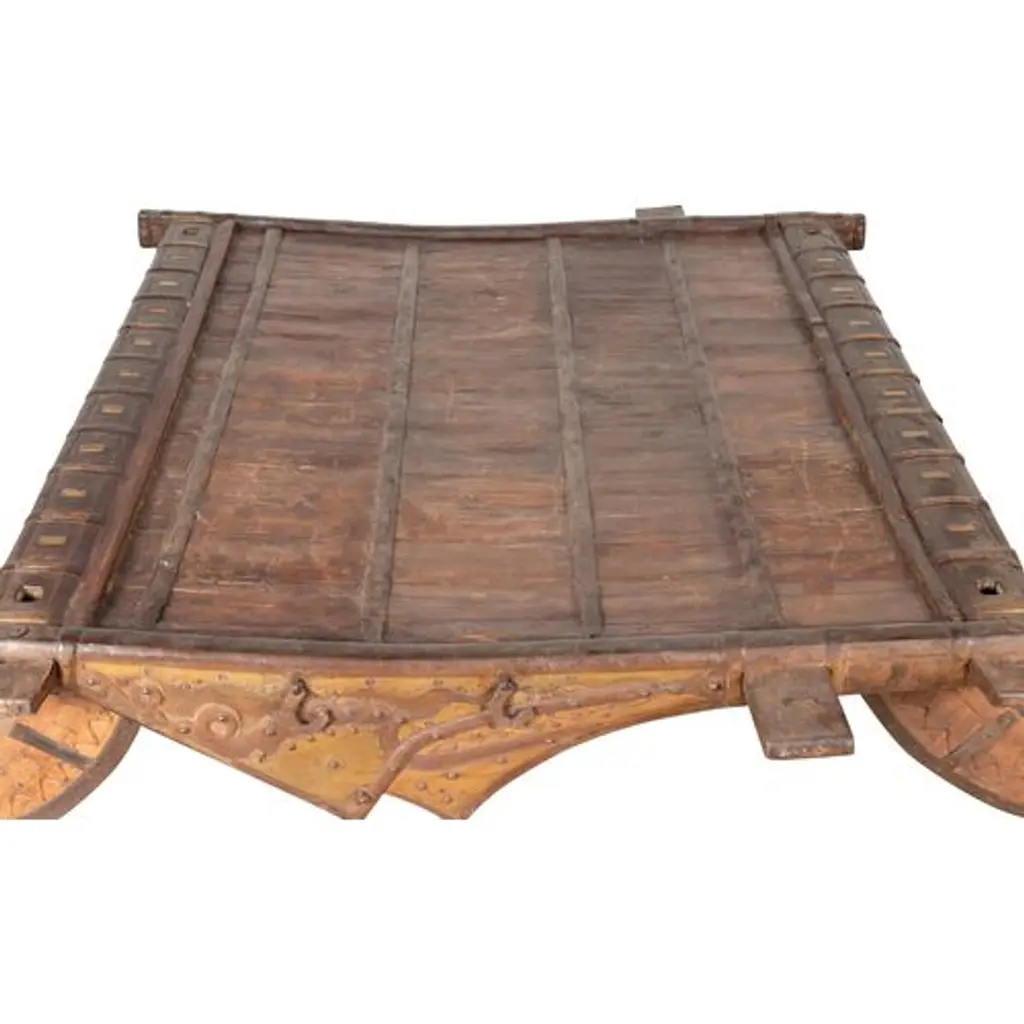 An Indian wood ox cart with metal accents from the 19th century, made into a coffee table. Perfect to be used as a coffee table, this conversation piece is an old wooden ox cart accented with metal accents and raised on curving legs. Whimsical in nature, its rustic looking rectangular wooden top shows a succession of metal braces, while the sides are adorned with square motifs pierced in their center. The front is adorned with scrolls and hooks that focus our attention.