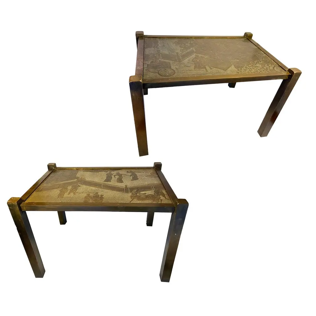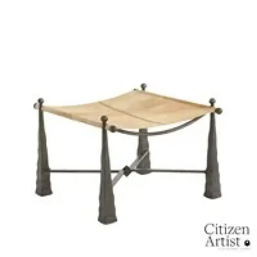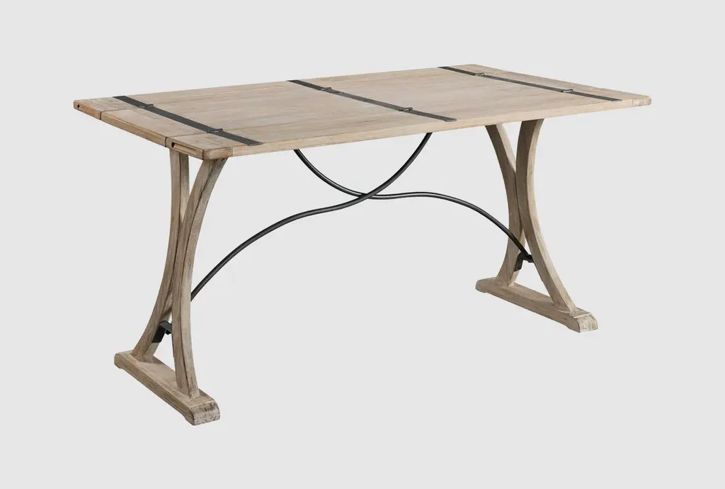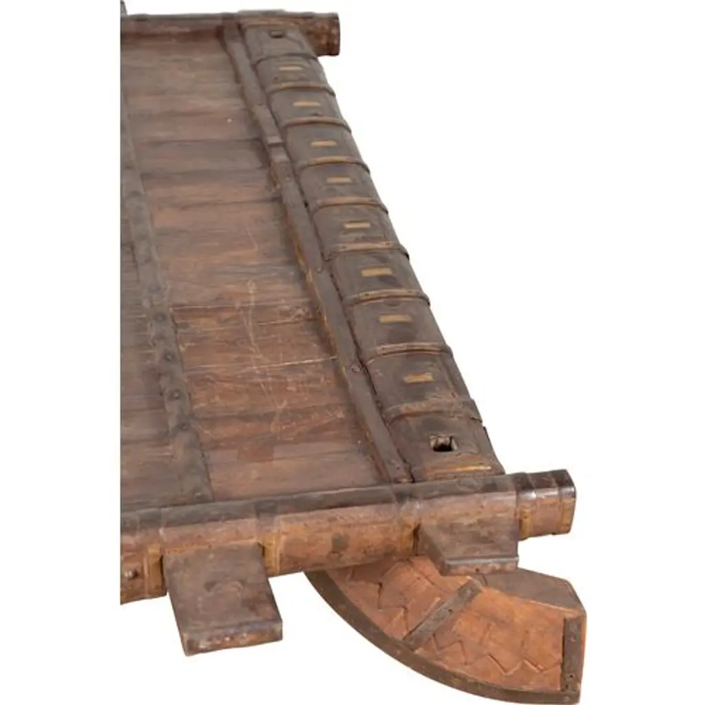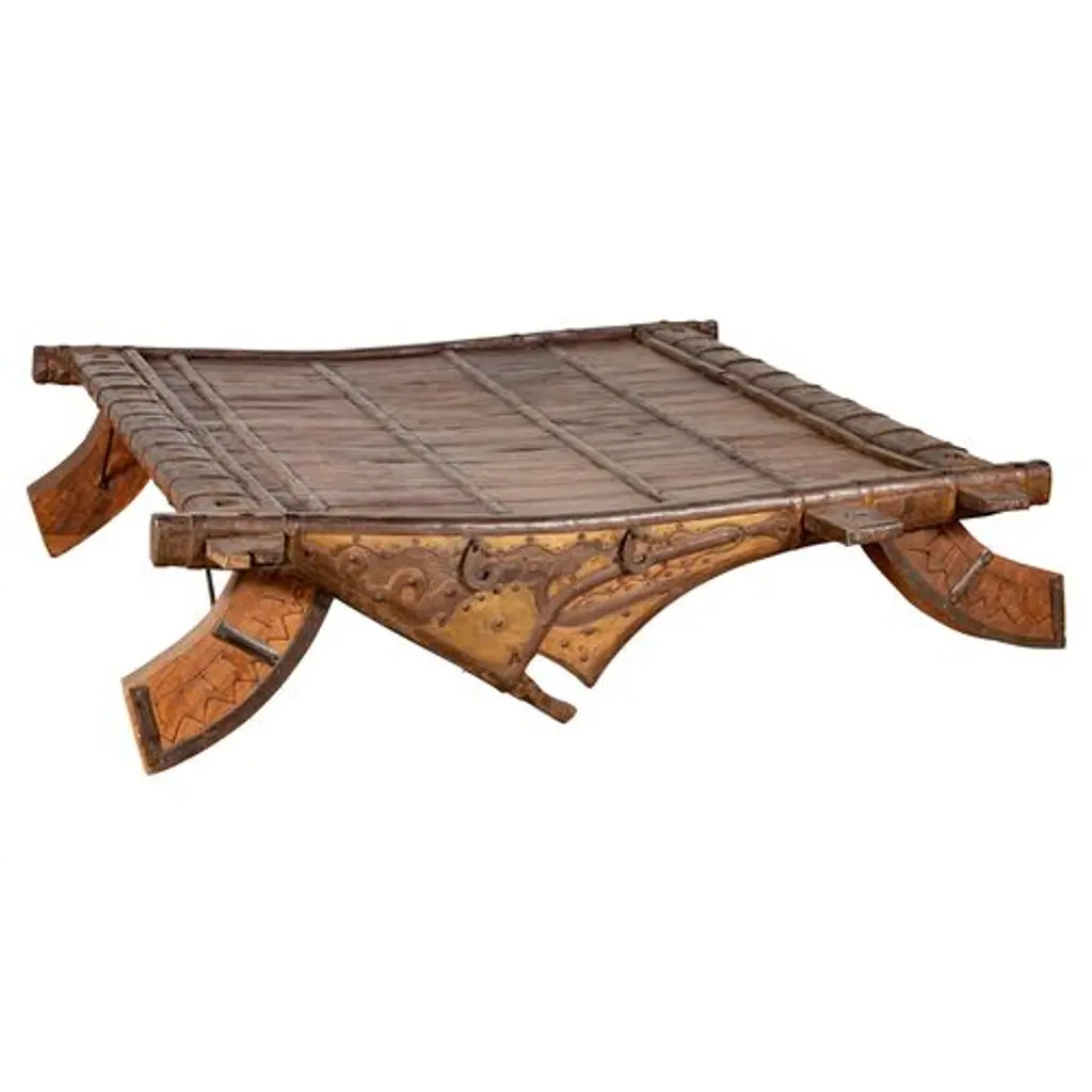 An Indian wood ox cart with metal accents from the 19th century, made into a coffee table. Perfect to be used as a coffee table, this conversation piece is an old wooden ox cart accented with metal accents and raised on curving legs. Whimsical in nature, its rustic looking rectangular wooden top shows a succession of metal braces, while the sides are adorned with square motifs pierced in their center. The front is adorned with scrolls and hooks that focus our attention.
