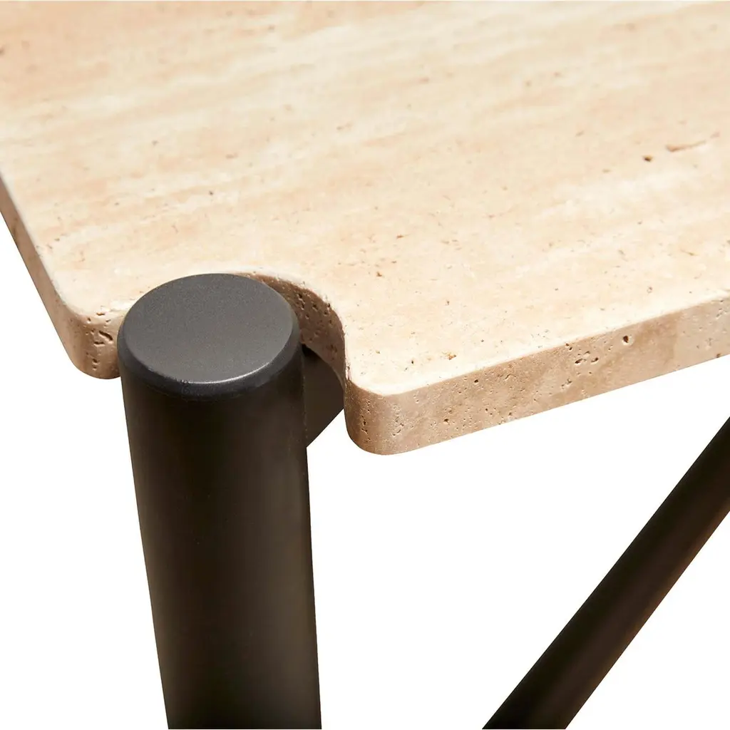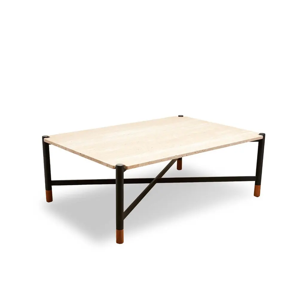 The outdoor Bronson coffee table features a turbo or walnut travertine top with notched corners that rests atop a powder coated steel base with teak feet. Can be used indoors or outdoors.The Lawson-Fenning Collection is designed and handmade in Los Angeles, California. Reach out to discover what options are currently in stock.